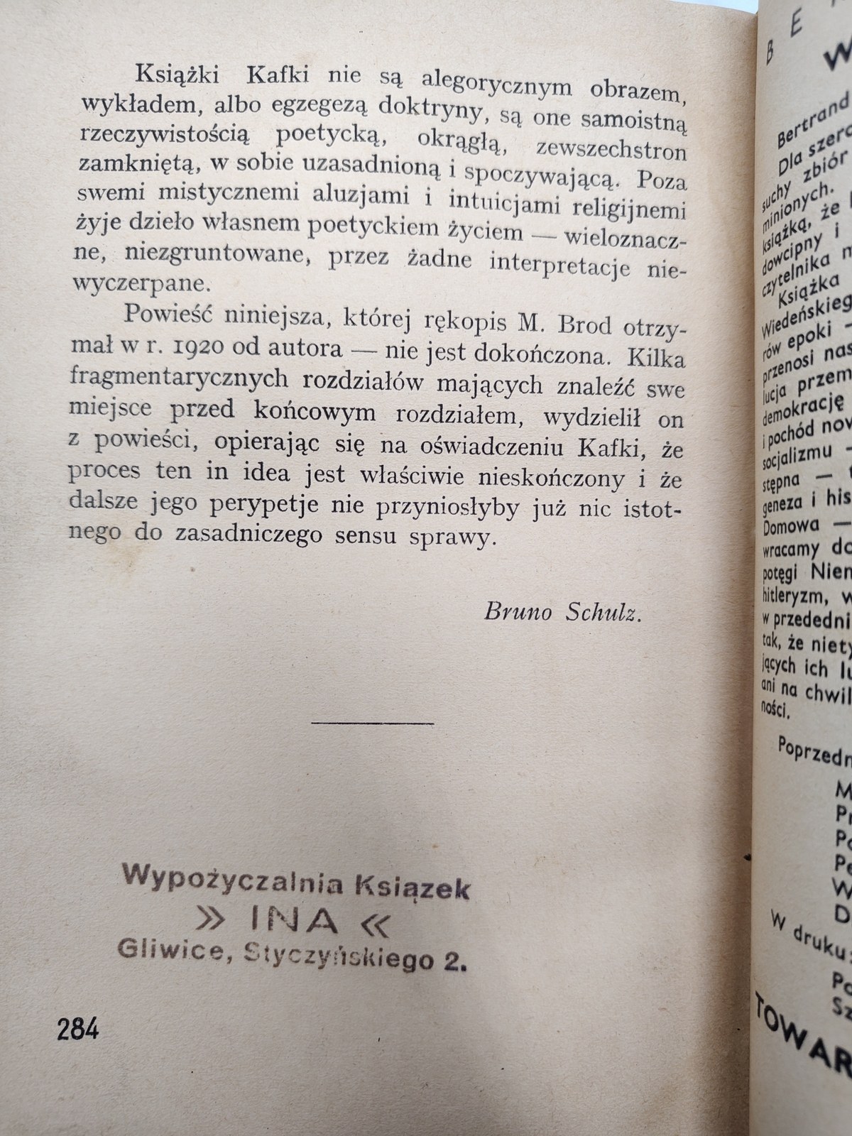 * Pierwsze polskie wydanie "Procesu" Franza Kafki w 1936 roku zostało przetłumaczone przez Józefinę Szelińską, narzeczoną Brunona Schulza. Choć na stronie tytułowej wydania widniało nazwisko Schulza, to on sam jedynie udzielał jej wskazówek i porad, a korekty dokonano pod jego nazwiskiem.