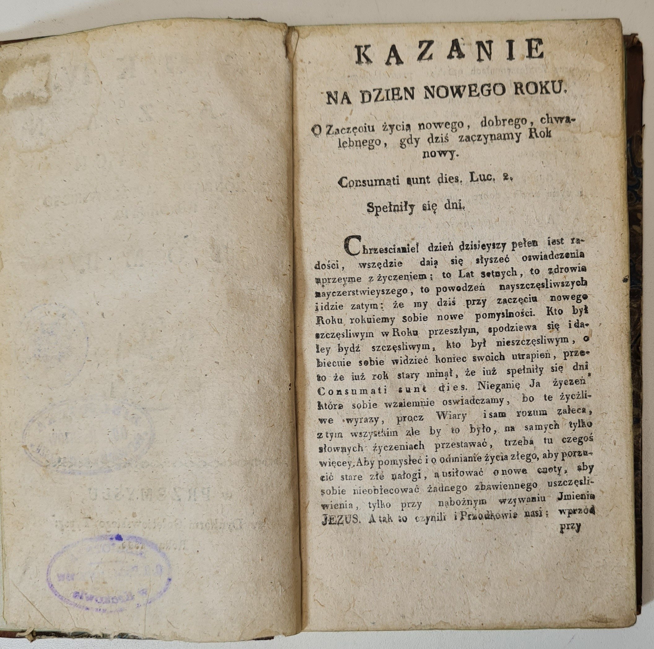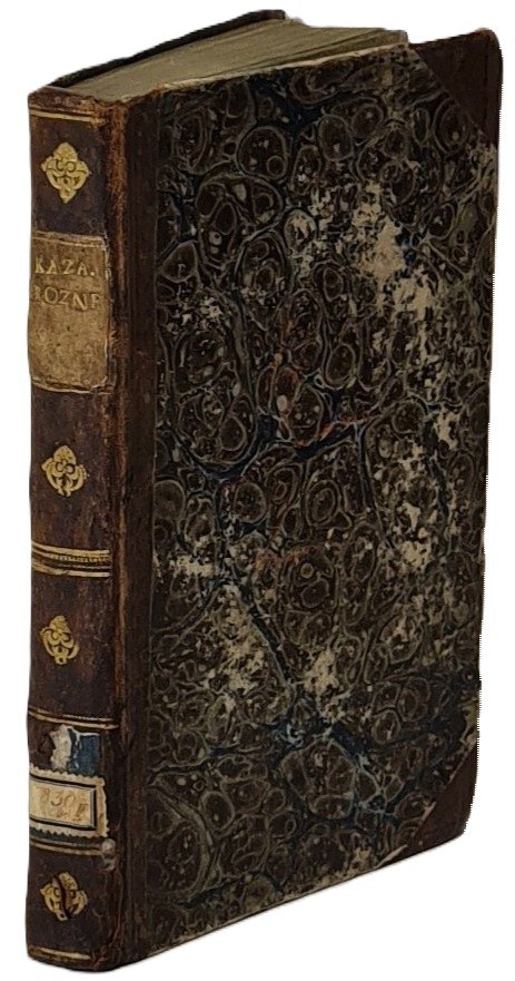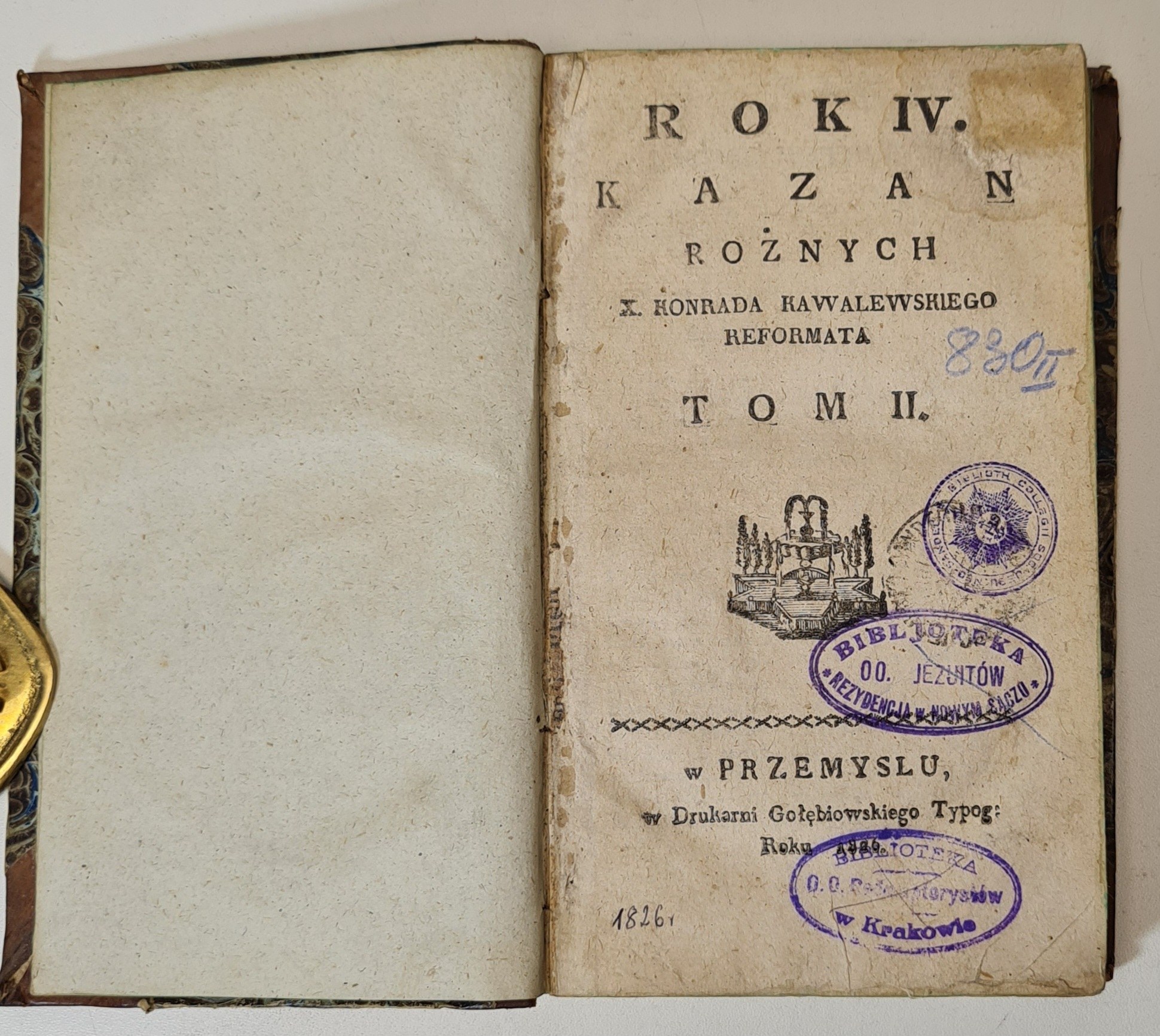 Kawalewski Konrad - Rok IV Kazań Rożnych (…) reformata. T. 2. Przemyśl 1826 , w Drukarni Jana Gołębiowskiego, s. 285, wym.11x19cm. Oprawa półskórek [z epoki], oprawa: otarcia i przetarcia kraw. opr., otarcia pow. opr. blok zwarty. Na str.tyt.i w środku różne pieczęcie własnościowe ( Jezuitów , Redemptorystów i dwie nieczytelne). Stan zachowania dobry