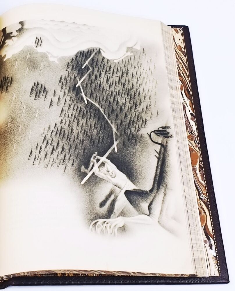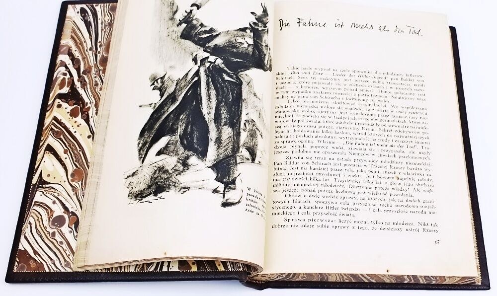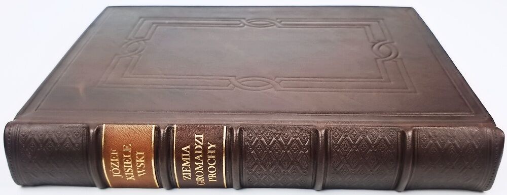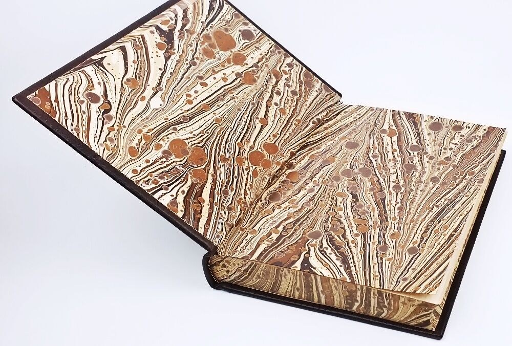 TWARDA OPRAWA PEŁNA SKÓRA WSPÓŁCZESNA. OKŁADKI OKOLONE MISTERNĄ BORDIURĄ. GRZBIET Z WYPUKŁYMI ZWIĘZAMI, TŁOCZENIAMI I ZŁOCENIAMI. WYKLEJKI MARMORYZOWANE, OBCIĘCIA KART MARMORYZOWANE TYM SAMYM WZOREM. WNĘTRZA OKŁADEK WYKOŃCZONE ŚLEPOTŁOCZONYM SZLACZKIEM