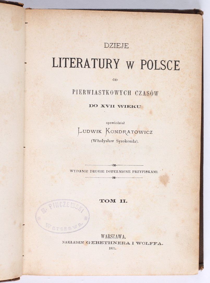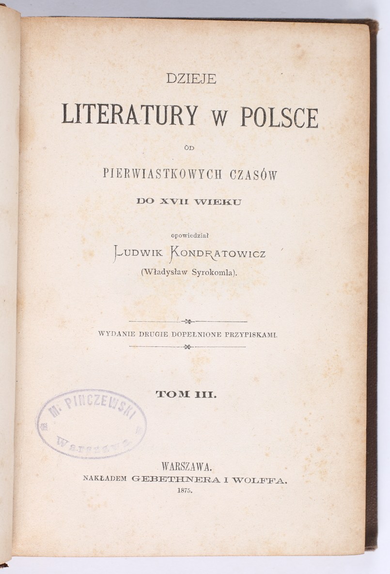 KONDRATOWICZ Ludwik (Władysław Syrokomla) - Dzieje Literatury w Polsce od pierwiastkowych czasów do XVII wieku. Tom 1-3. Wydanie drugie dopełnione przypisami. Warszawa 1875. Nakładem Geberthnera i Wolffa.