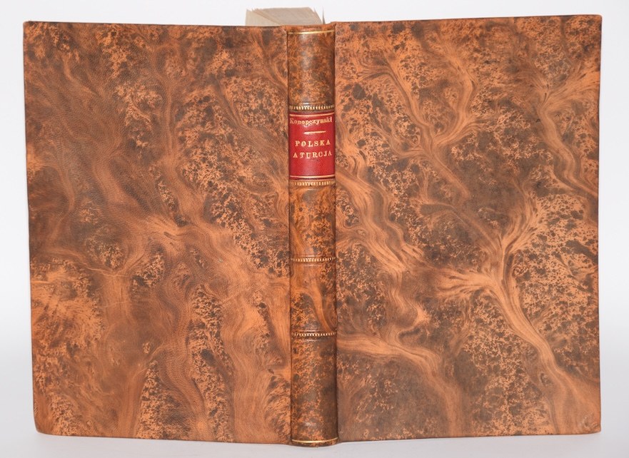 - Oprawa: twarda skóra barwiona z szyldzikiem na grzbiecie