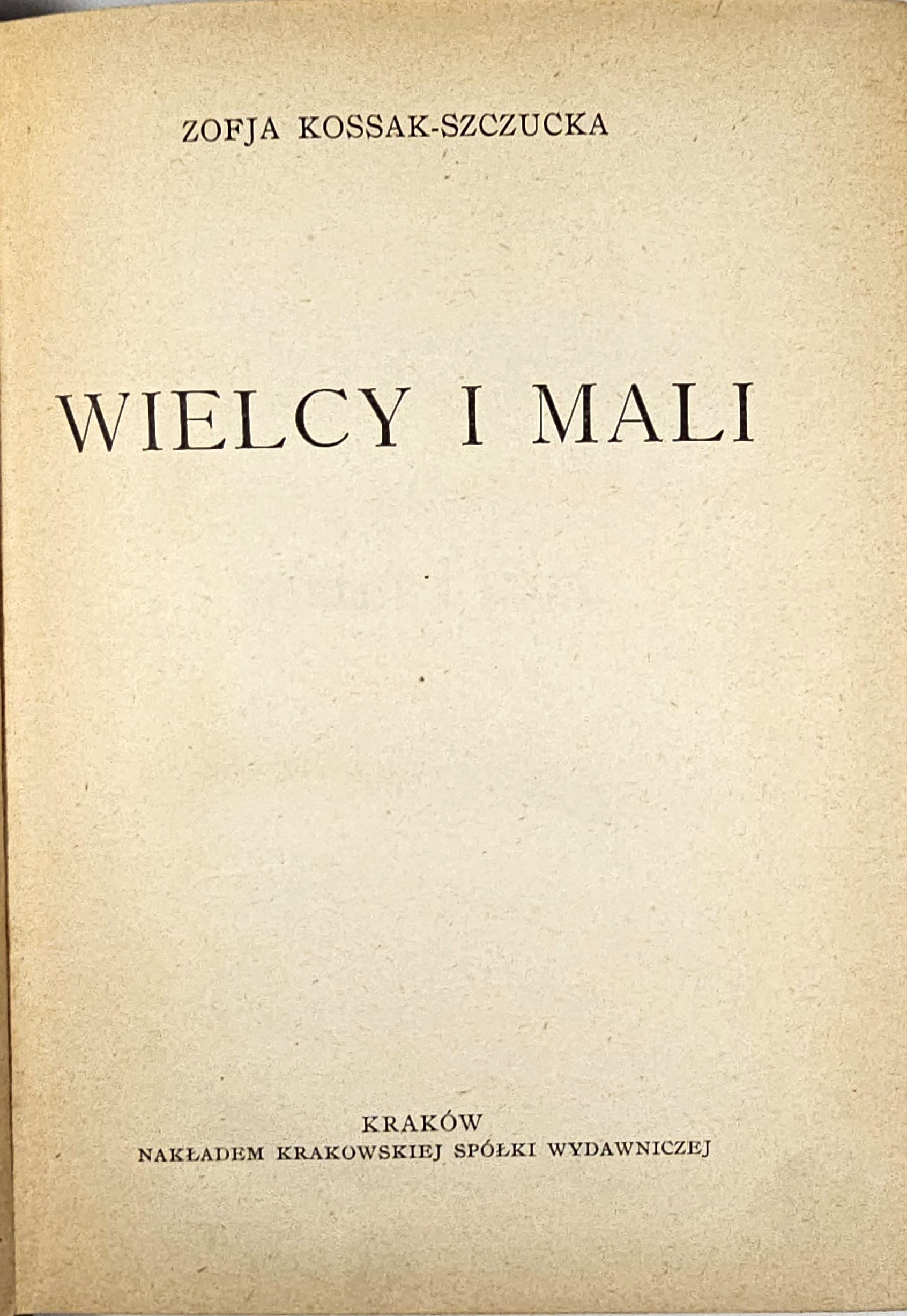 19.5 cm, s. [4], 225, [1, opr. pł. sygn.: Piotr Grzywa. Introligator. Kraków. Stan dobry. Treść: Wielcy i mali. Ostatnia księżna Cieszyńska. Historja Ondraszka, Szebesty, zbójnika. Imko Wisełka.