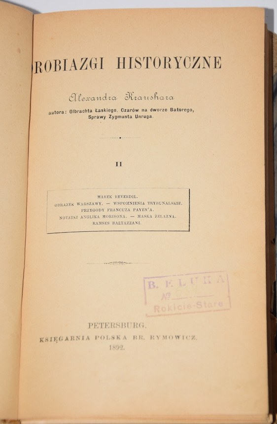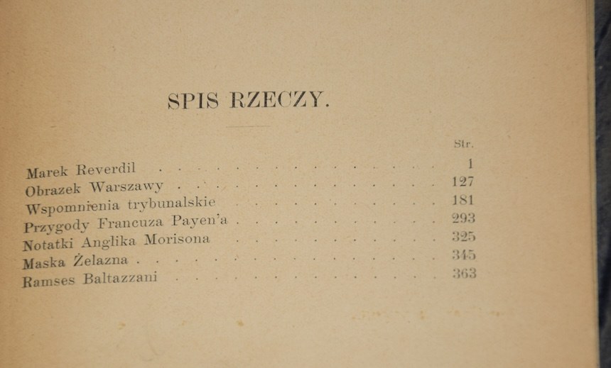 Zawiera: Marek Reverdil, Obrazek Warszawy, Wspomnienia trybunalskie, Przygody francuza Payen'a, Notatki anglika Morisona, Maska żelazna, Ramses Baltzaani.