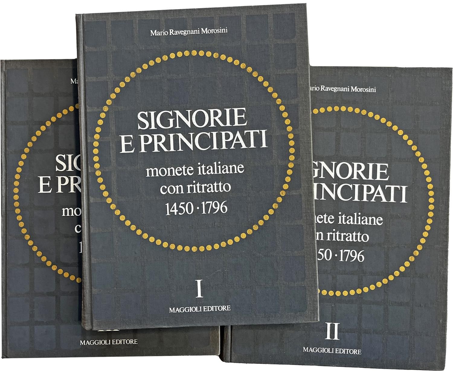 Ravegnani Morosini M., Signorie e principati monete italiane con ritratto 1450-1796, Dogana 1984, III voll. completo. Opera fondamentale per la numismatica italiana. Macchie d'umidità leggere sparse ma buono stato, consigliabile la visione diretta