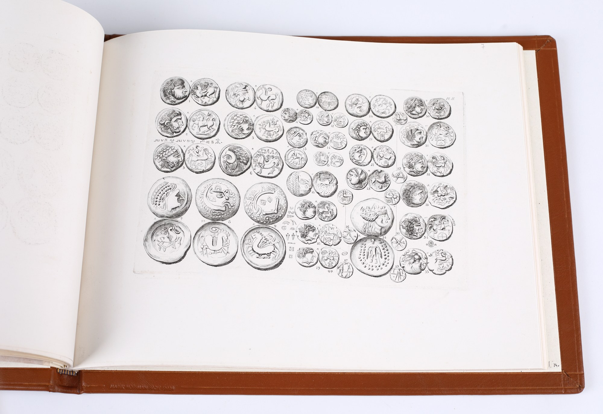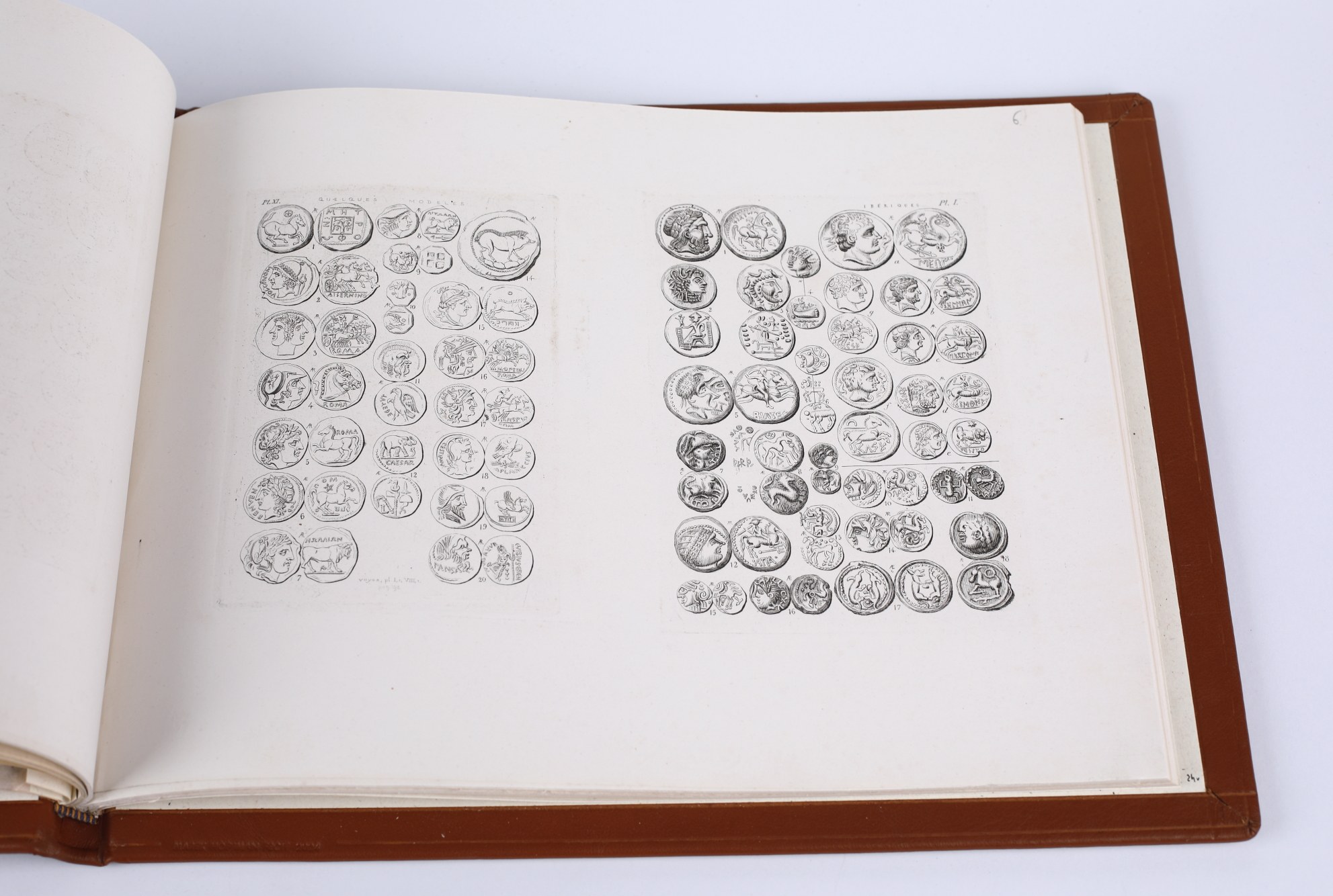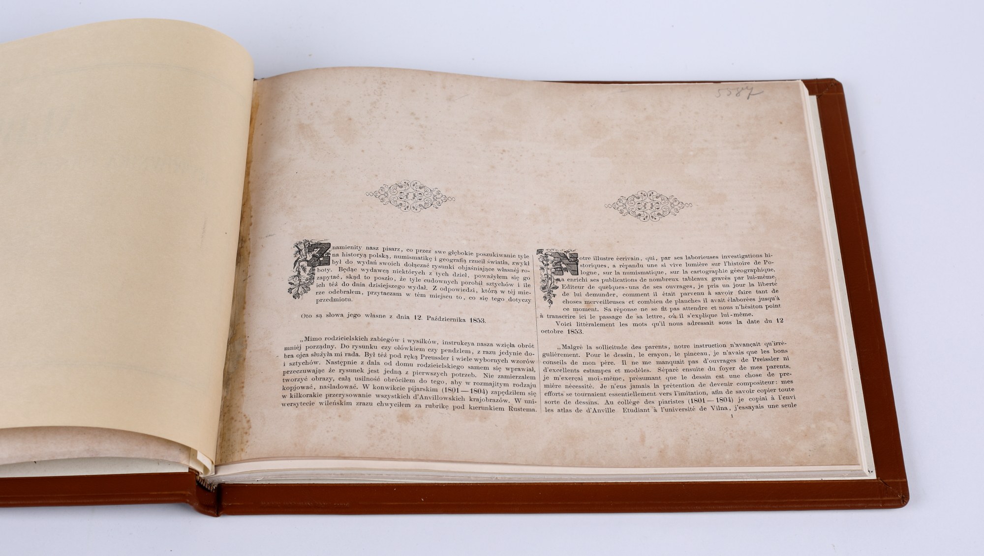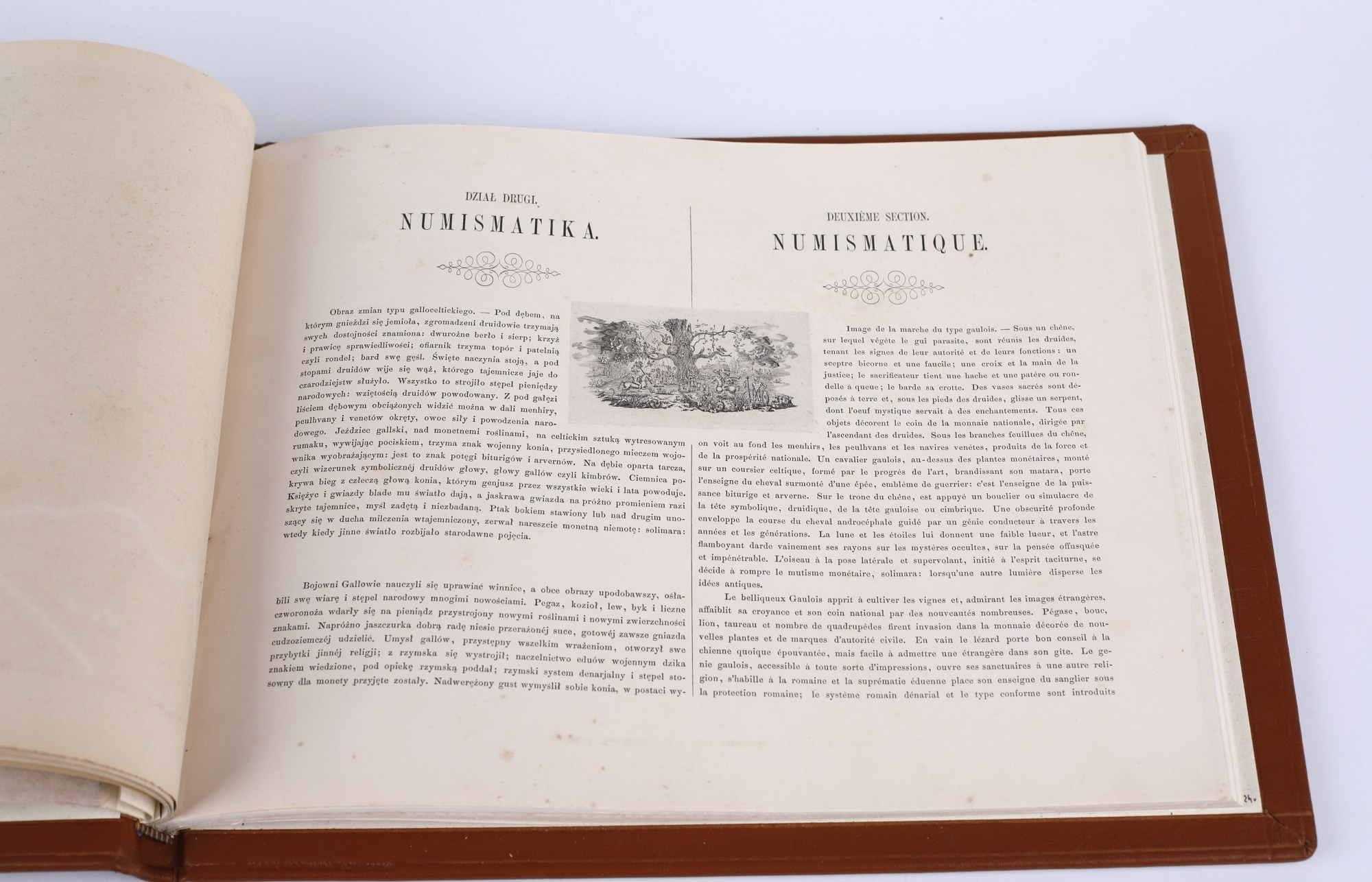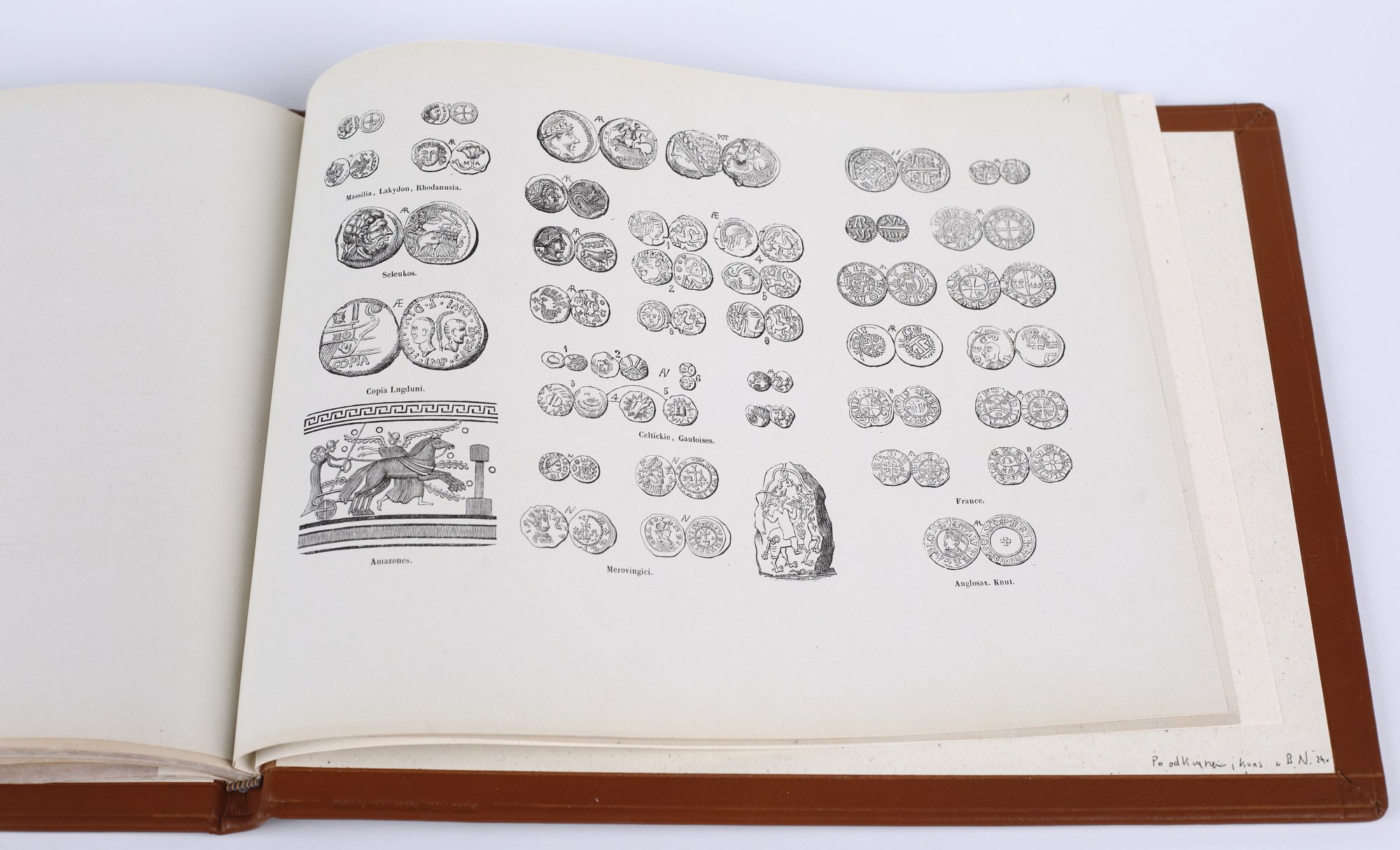 Znakomite dzieło z autorskimi rycinami Joachima Lelewela (1776-1861) - historyka, numizmatyka, bibliografa, grafika i polityka, zbierające jego najważniejsze prace rytownicze. Tytuł dzieła oraz wstęp i teksty z objaśnieniami w jęz. polskim i francuskim. Całość podzielona na części: Krajobrazy (11 k. tabl. z mapami), Numismatyka (15 tabl. oryg. oraz 1 plansza w fotokopii), Dział polski (12 tabl. z monetami, mapami i nagrobkami), Wyciętki typograficzne (3 tabl. z monetami obcymi).