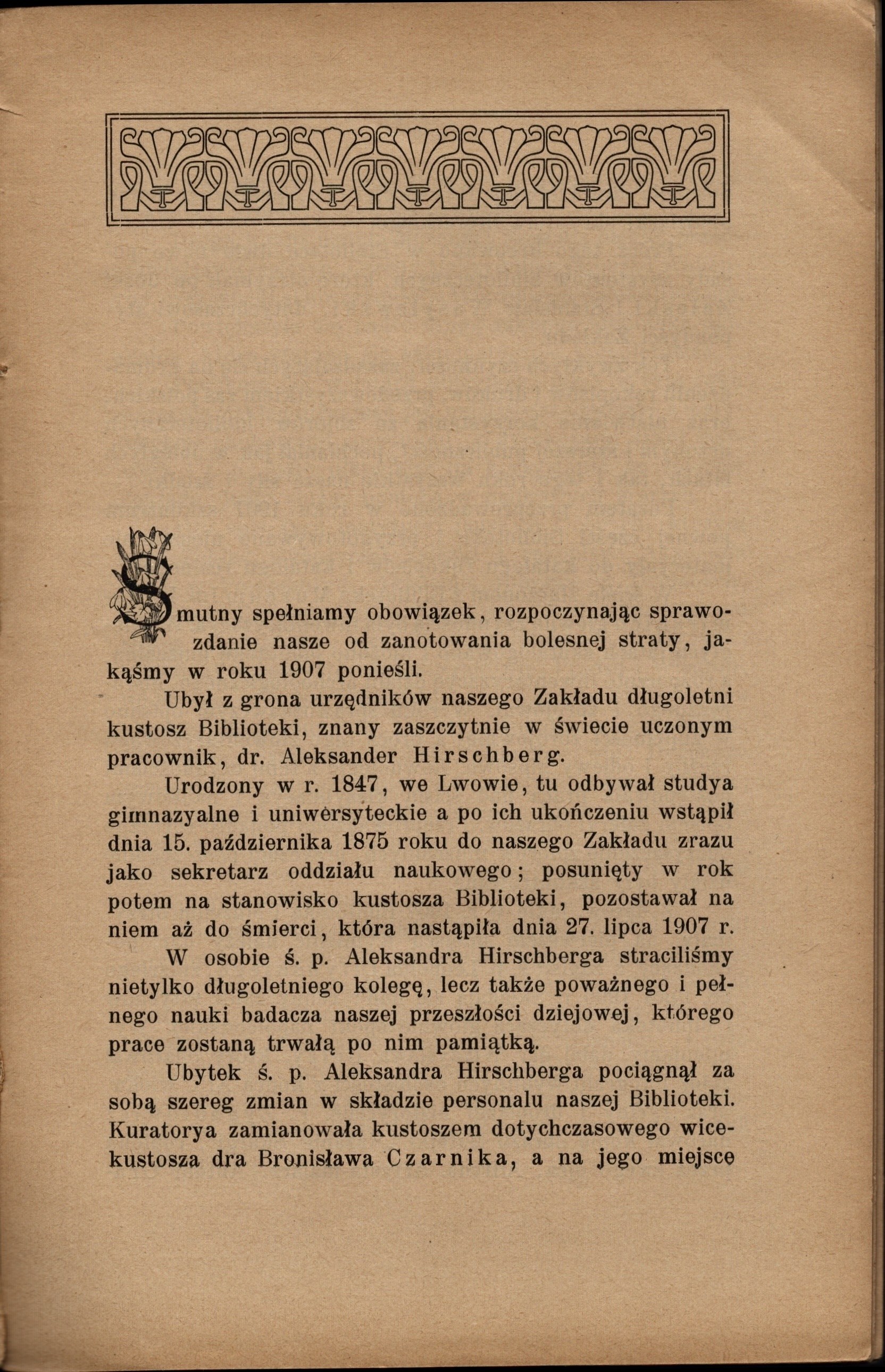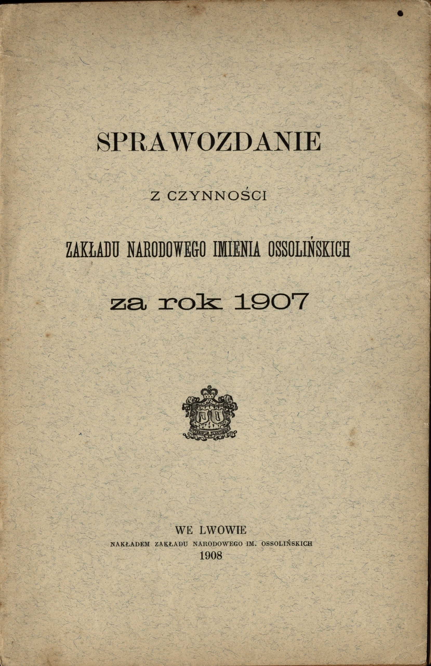 [Ossolineum] Sprawozdanie z czynności Zakładu Narodowego Imienia Ossolińskich za rok 1907. Lwów 1908. Nakładem Zakł. Nar. Im. Ossolińskich
