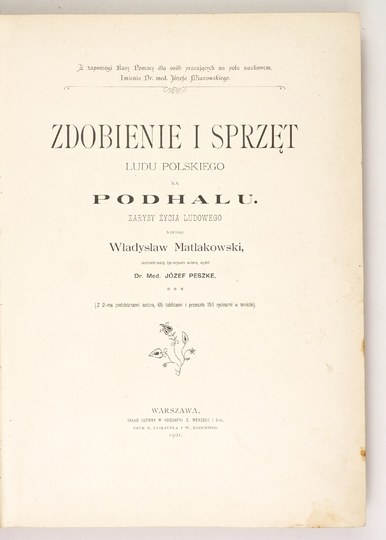 MATLAKOWSKI Władysław - Zdobienie i sprzęt ludu polskiego na Podhalu. Zarysy życia ludowego. Poprzedziwszy życiorysem autora, wydał Józef Peszke. (Z 2-ma podobiznami autora, 65 tablicami i przeszło 150 ryc. w tekście). Warszawa 1901. Druk. P. Laskauera i W. Babickiego. 4, s. [12], XCI, [3], 176, [4], tabl. 65. opr. psk. z epoki, okł. brosz. naklejone na oprawę.