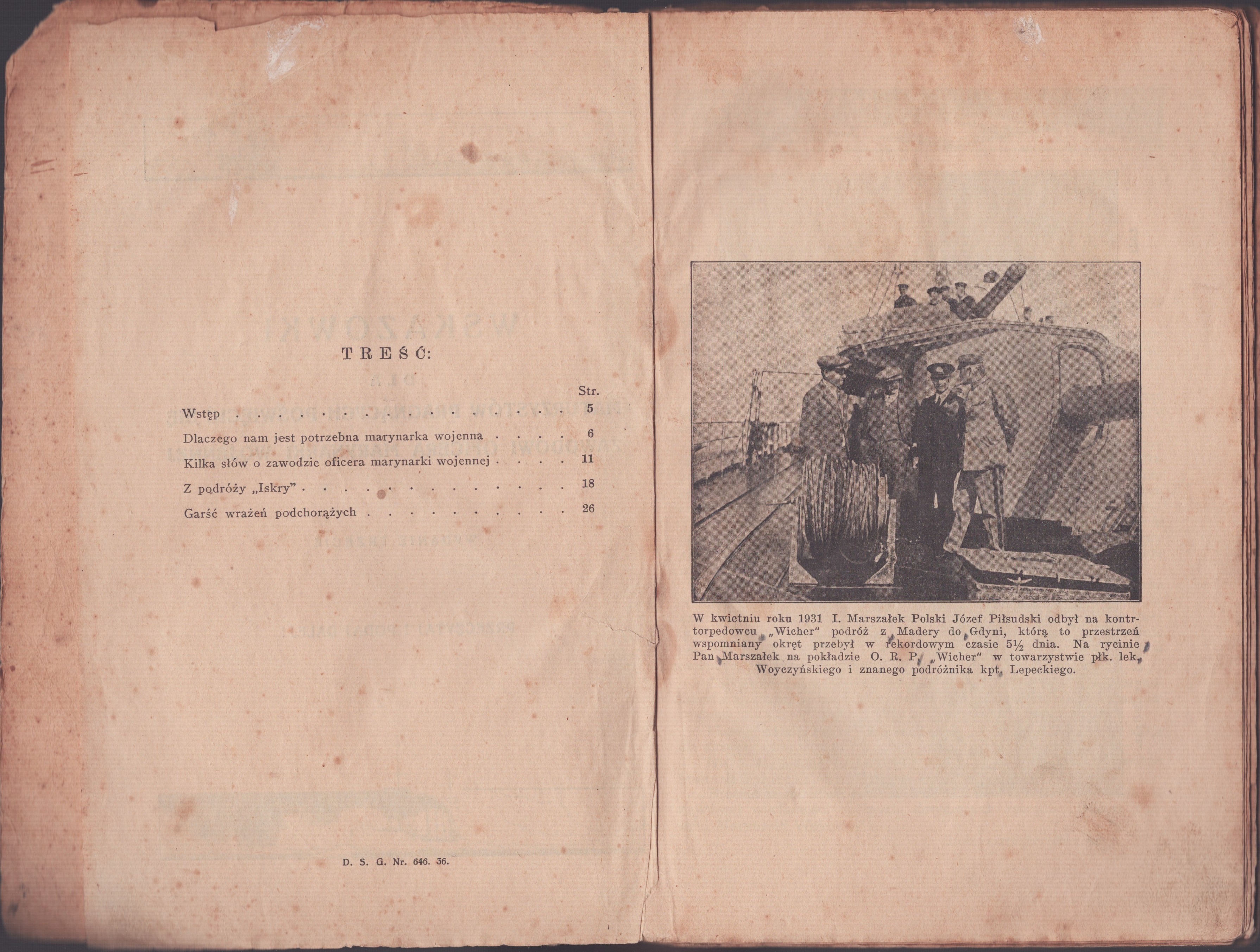 Ze spisu treści: Wstęp; Dlaczego nam jest potrzebna marynarka wojenna; Kilka słów o zawodzie oficera marynarki wojennej; Z podróży "Iskry"; Garść wrażeń podchorążych.