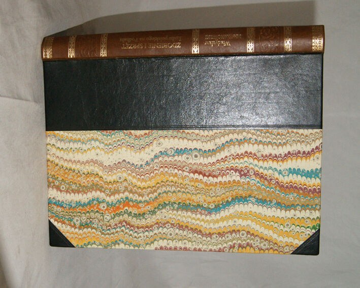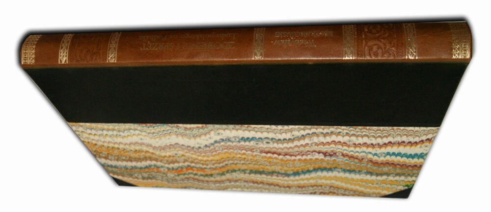 TWARDA OPRAWA SZEROKI PÓŁSKÓREK WSPÓLCZESNY, GRZBIET Z TŁOCZENIAMI I ZŁOCENIAMI ESTETYKĄ NAWIĄZUJĄCY DO OPRAW Z EPOKI, SKÓRA NA LICACH I W NARTOŻNIKACH PODBRAWIONA NA ZIELONO CELEM SCHARMONIZOWANIA Z PAPIEREM MARMURKOWYM OKŁADEK, OBCIĘCIA BARWIONE NA ZIELONO. ZACHOWANAE OKŁADKI KARTONOWE WYDAWNICZE. EFEKTOWNA OPRAWA!