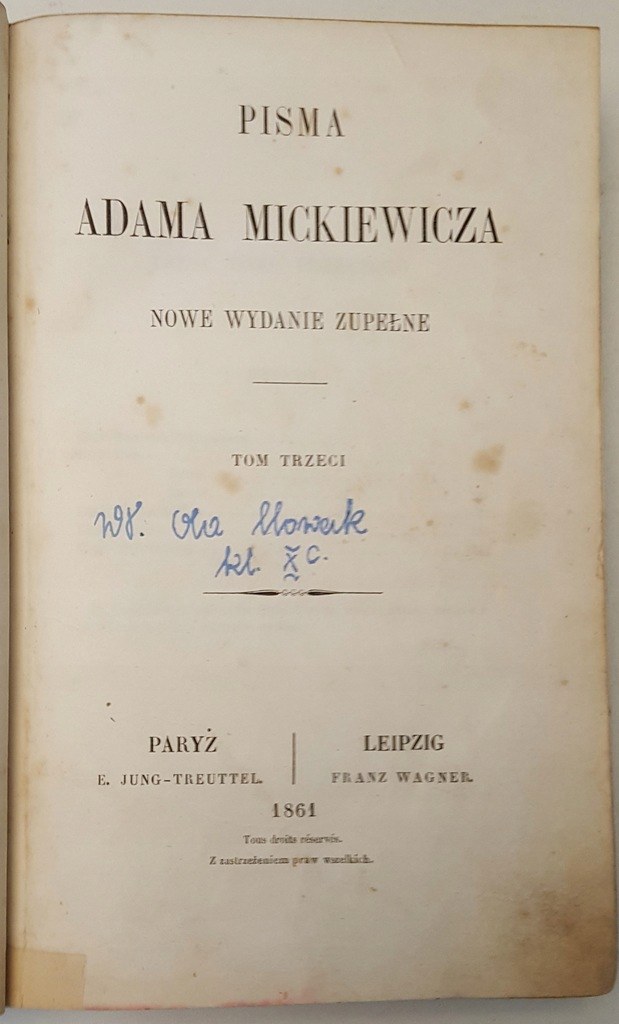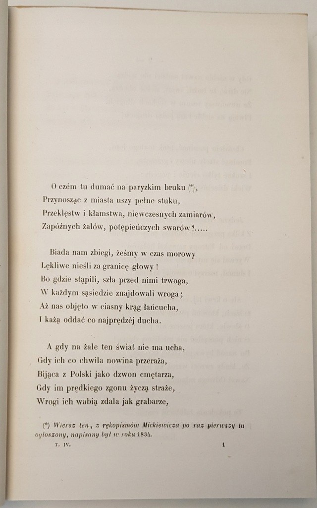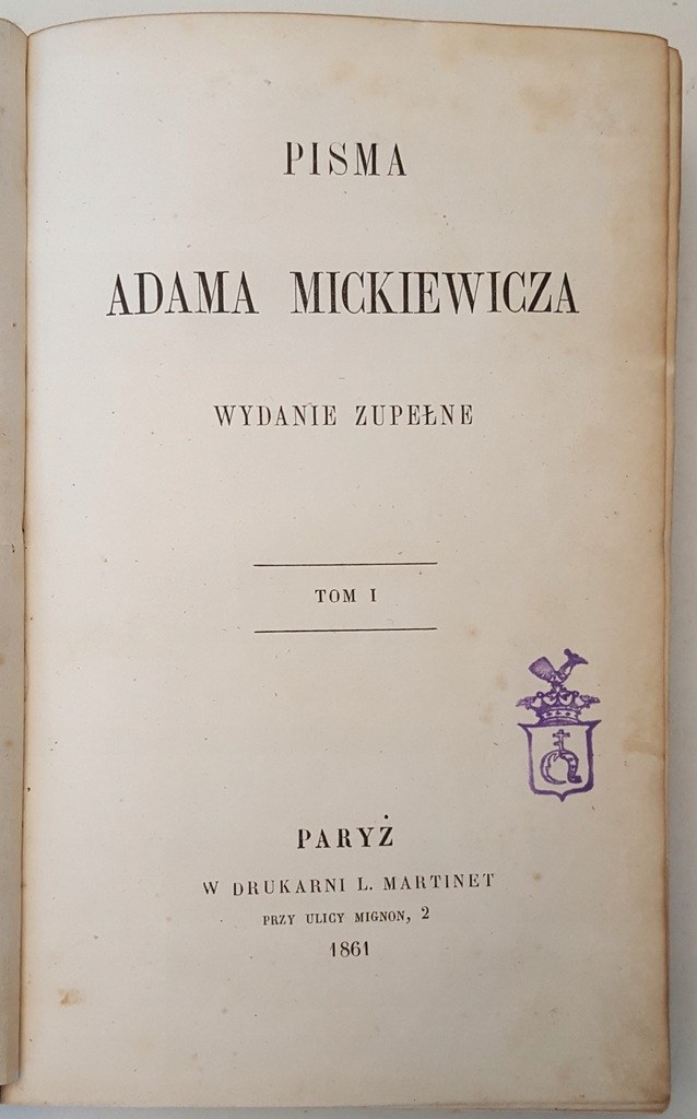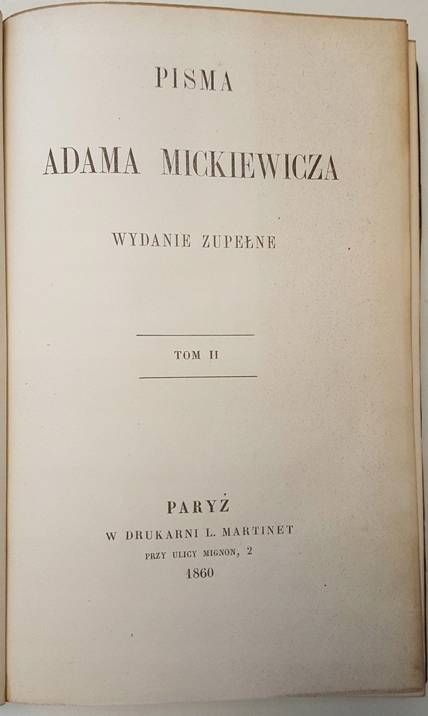 Wydanie zupełne przez dzieci autora wydane. Drukarnia L.Marinet, Paryż 1860-1861r.. Tom I - Ballady i romanse. Sonety. Powiastki i bajki. Wiersze różne; str. 500. Tom II - Grażyna. Konrad Wallenrod. Giaur. Sonety Krymskie. Zdania i uwagi; str. 330 . Tom III - Dziady; str. 431 - Nowe Wydanie Zupełne, Wydanie Paryż -Leipzig 1861. Tom IV - Pan Tadeusz. Księga 1-6, str. 296: MICKIEWICZ - PAN TADEUSZ Wydanie z EPILOGIEM O czym tu dumać PIERWODRUKI. Tom V - Pan Tadeusz. Księga 7-12, str. 269.