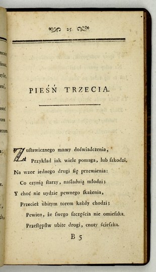 E. 20, 223. Skrajne karty podklejone w grzbiecie, zaplamienia kart w dolnym narożniku, karta tyt. nieco otarta, z podklejonym niewielkim ubytkiem. Trzecie wydanie (po wcześniejszych z 1775 i 1778) poematu heroikomicznego biskupa Krasickiego "opiewającego wojnę kotów z myszami i szczurami, wywołaną zmiennością faworów książęcych, a zakończoną, po przejściowych niepowodzeniach wojska myszego, śmiercią księcia Popiela zgodnie z podaniem o Myszej Wieży na Gople" (LPPE). Utwór zawiera "krytykę szlacheckiej obyczajowości, awanturnictwa, egoizmu i przekupstwa posłów. Wyśmiewa literacką manierę baroku i sentymentalizm. Celem pisarza było wykpienie tradycyjnej historiografii, która nie liczyła się z prawdą historyczną i chętnie posługiwała się baśnią, legendą czy zmyśleniem" (Wikipedia).