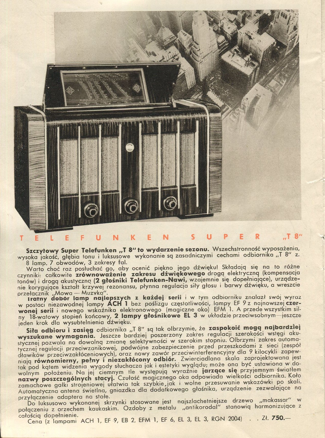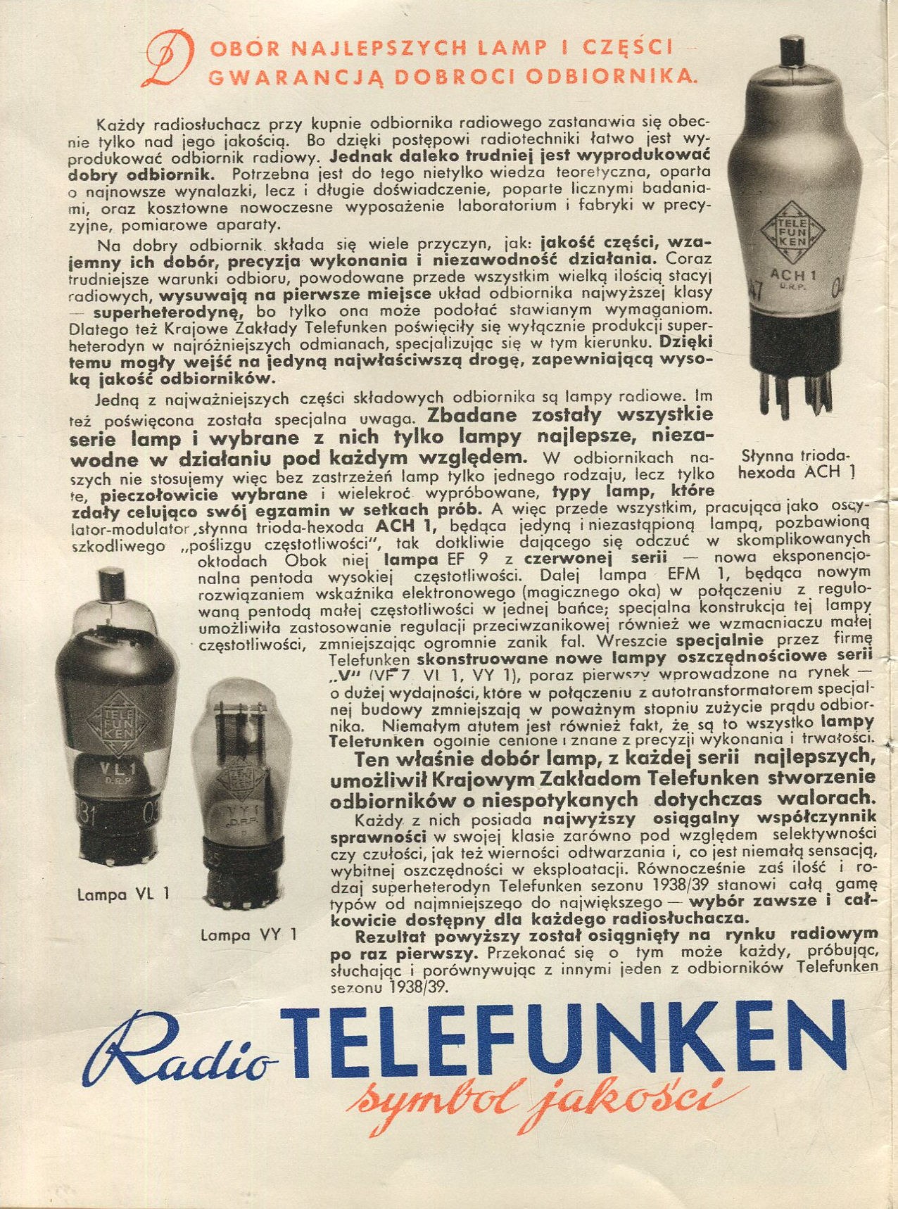 Katalog reklamowy odbiorników Telefunken. Polski oddział niemieckiej firmy Telefunken został założony w październiku 1933 roku i należał do nielicznych firm konkurujących z polskim oddziałem Philipsa. Na początku 1938 roku przeszedł gruntowną reorganizację, po której przyjął nazwę Krajowe Zakłady Telefunken Spółka Akcyjna. Specjalizował się wyłącznie w produkcji radiowych odbiorników dla szerokiego grona odbiorców. Jego intensywny rozwój przerwał wybuch II wojny światowej.