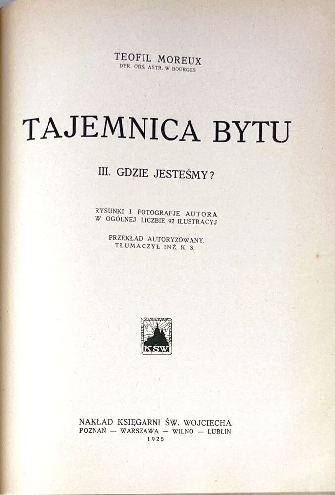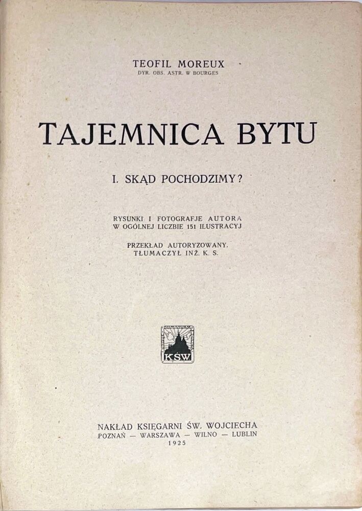 Najbardziej poczytne dzieło Teofila Moreaux (1867-1954) – francuskiego astronoma i meteorologa, dyrektora obserwatorium astronomicznego w Bourges. „Jest to książka jedyna w swoim rodzaju. W czterech częściach [...] porusza tak wielkie mnóstwo zagadnień z dziedziny kosmogonii, geologii, prehistorii, etnologii etc., że tylko człowiek olbrzymiej zaiste erudycji i pierwszorzędnego talentu pisarskiego, jakim jest X. Moreaux, mógł to wszystko powiązać w jednolitą całość, udostępnić czytelnikom niefachowym i podać w formie niemal felietonowej” (Z przedmowy).