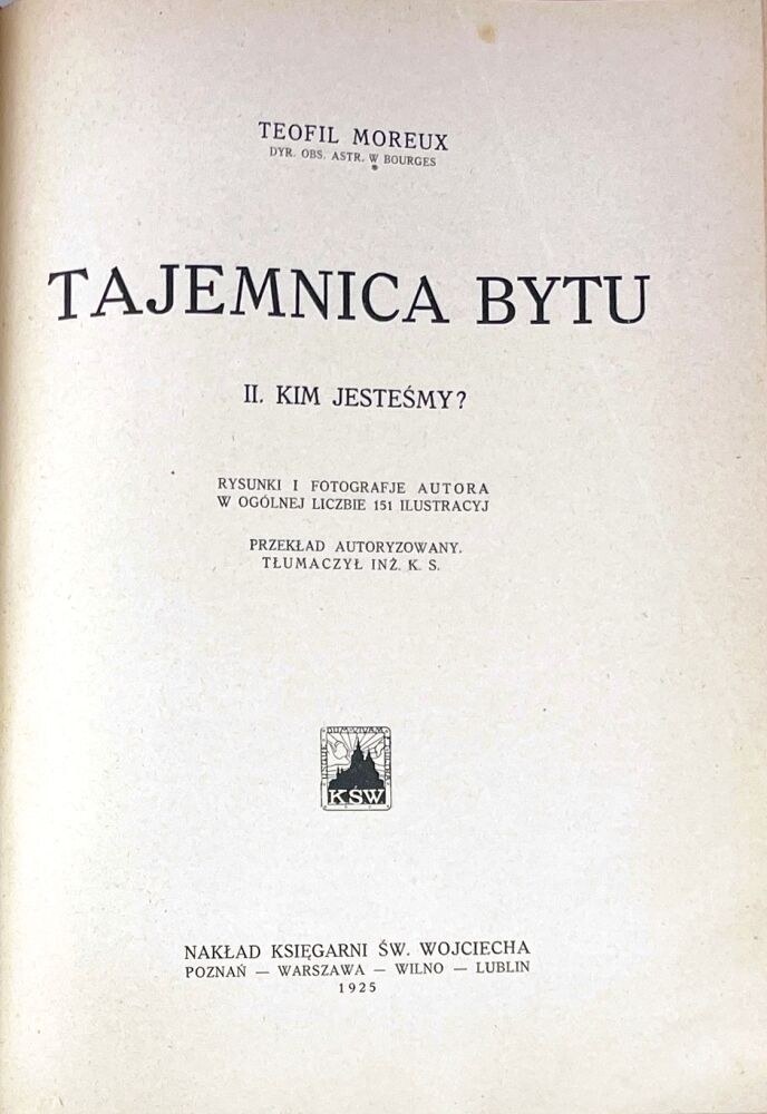 II. Kim jesteśmy? Rysunki i fotografje autora w ogólnej liczbie 151 ilustracyj. Przekład autoryzowany. Tłumaczył inż. K[onstanty] S[edlaczek]. Poznań [i in.] 1925. Nakład Księgarni Św. Wojciecha, s. [4], 135, [4], ilustr. w tekście; acc.: