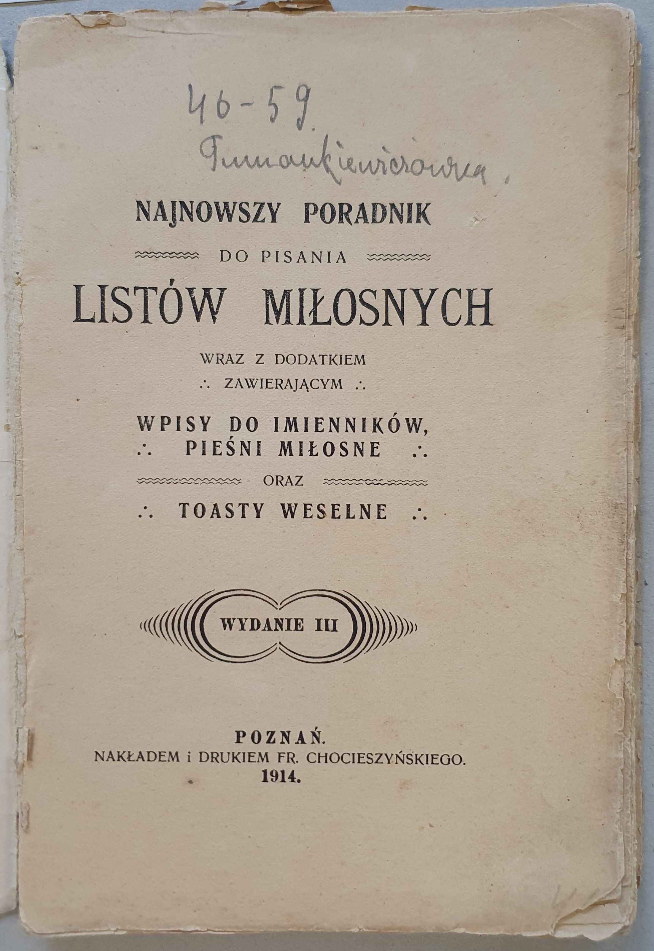 Najnowszy poradnik do pisania listów miłosnych wraz z dodatkiem zawierającym Wpisy do imienników, Pieśni miłosne oraz Toasty weselne. Wydanie III. Poznań: Nakładem i Drukiem Fr. Chocieszyńskiego, 1914.