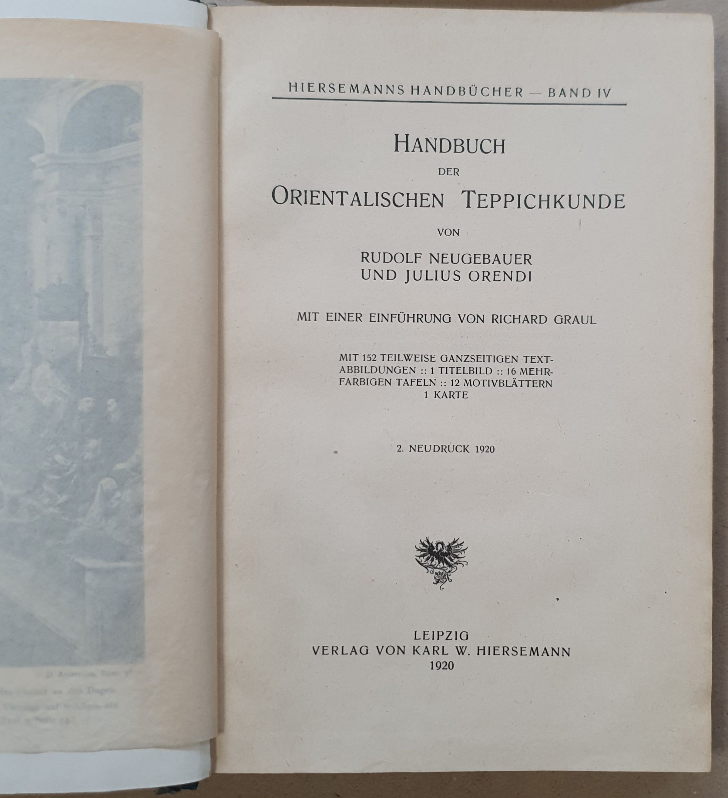 Neugebauer Rudolf von, Orendi Julius - Handbuch der Orientalischen Teppichkunde mit einer Einführung von Richard Graul. Mit 152 Teilweise Ganzseitigen Text-abbildungen :: 1. Titelbild :: 16 mehrfarbigen Tafeln :: 12 Motivblätten 1 Karte. Leipzig: Karl W. Hiersemann, 1920. Wyd.2. [Seria wydawnicza:] Hiersemann's Handbücher , Band IV.