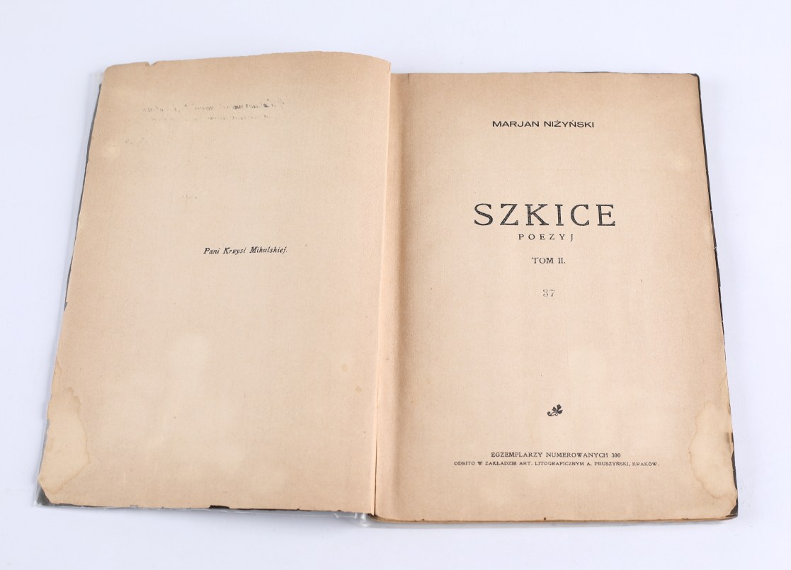 NIŻYŃSKI Marjan - Szkice poezyj. Tom. II. Kraków 1931. Zakład Art. Litograficzny A. Prószyński [dedykacja autora]