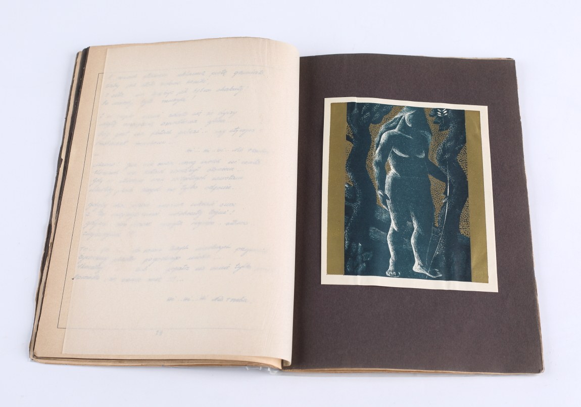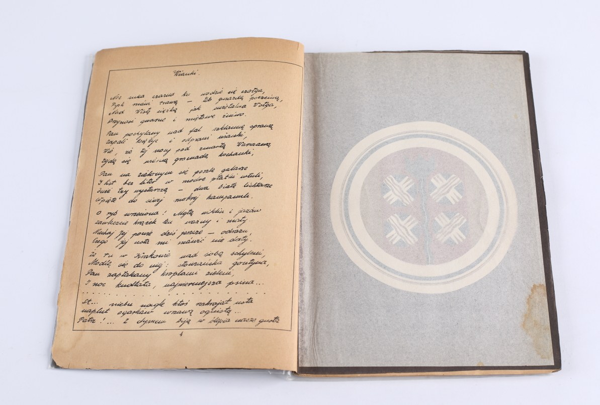 Bibliofilsko wydany tom poezji Marjana Niżyńskiego (1910-1943), odbity w formie rękopisu powielanego metodą litograficzną, z dodaniem 13 tabl. z oryg. litografiami. Tom dedykowany w druku "Krzysi Mikulskiej".