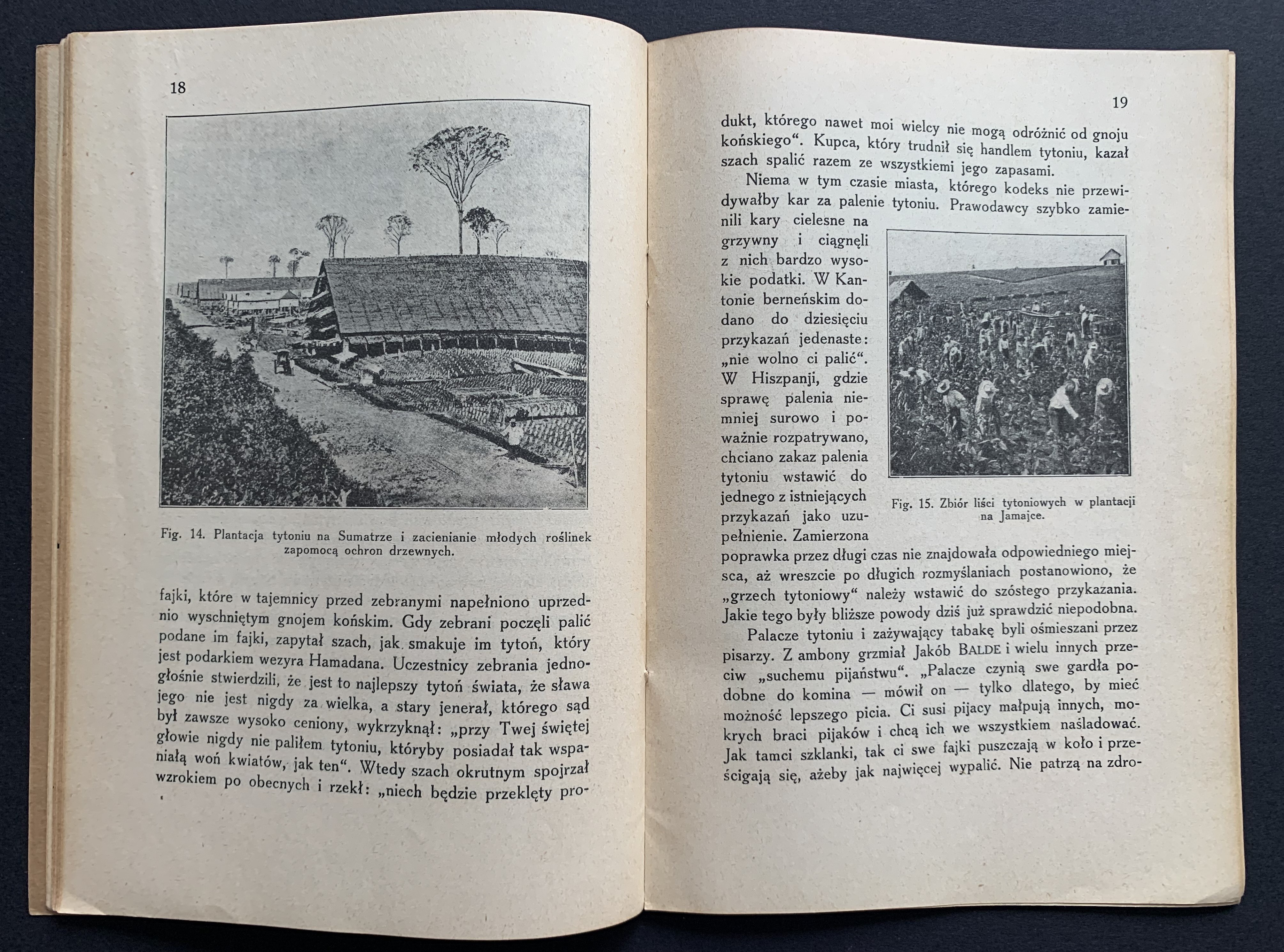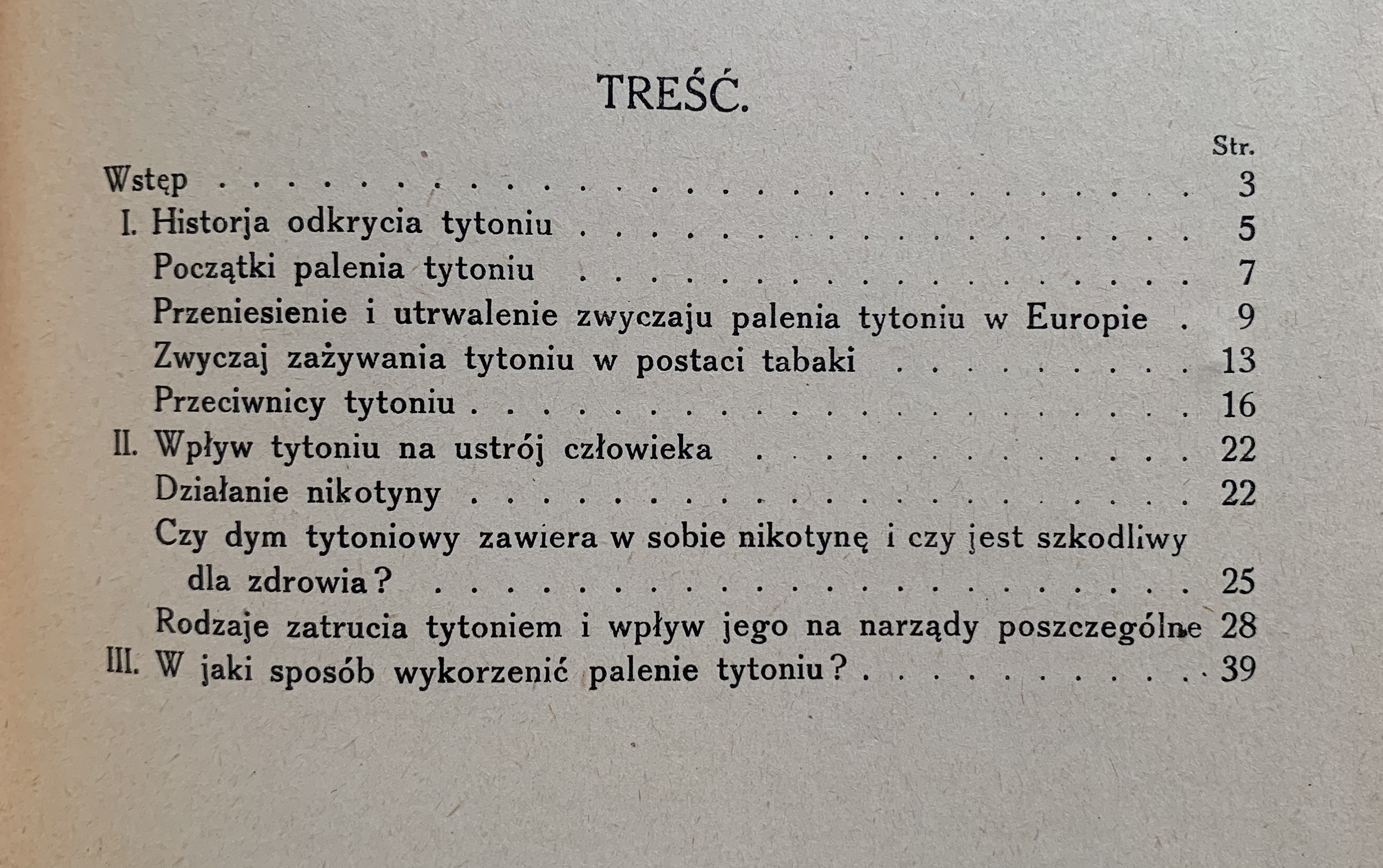 Zawiera m.in.: Historia odkrycia tytoniu, Początki palenia tytoniu, Przeniesienie i utrwalenia palenia tytoniu w Europie, Zwyczaj zażywania tytoniu w postaci tabaki, Przeciwnicy tytoniu, Wpływ tytoniu na ustrój człowieka.