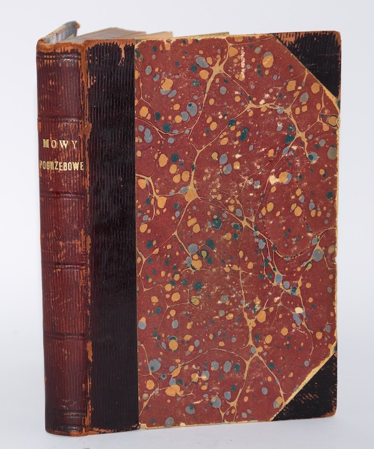 - Oprawa: twarda półskórek (również narożniki) z złoceniami na grzbiecie, ozdobny papier na licach i wyklejkach, marmoryzowane brzegi kart