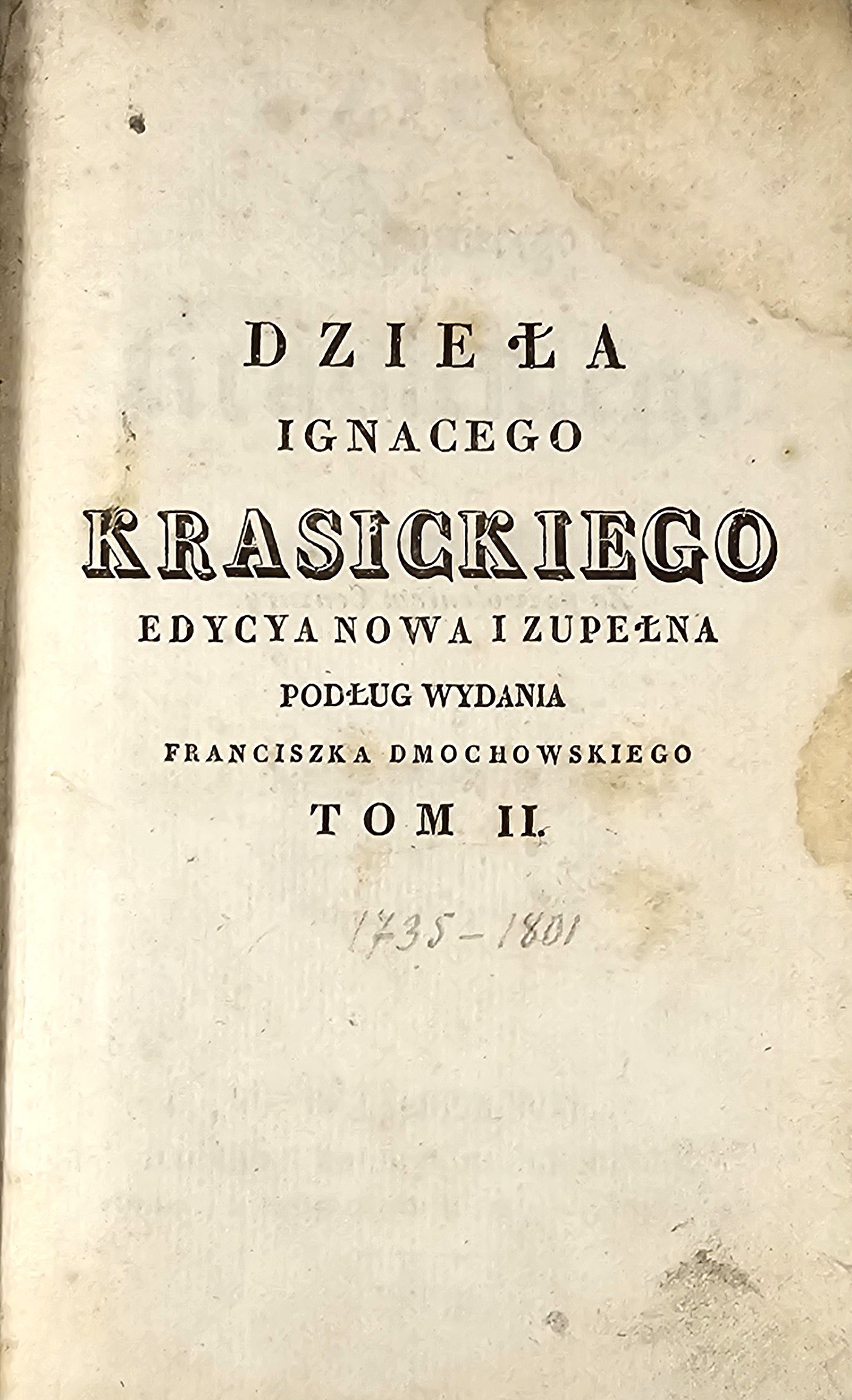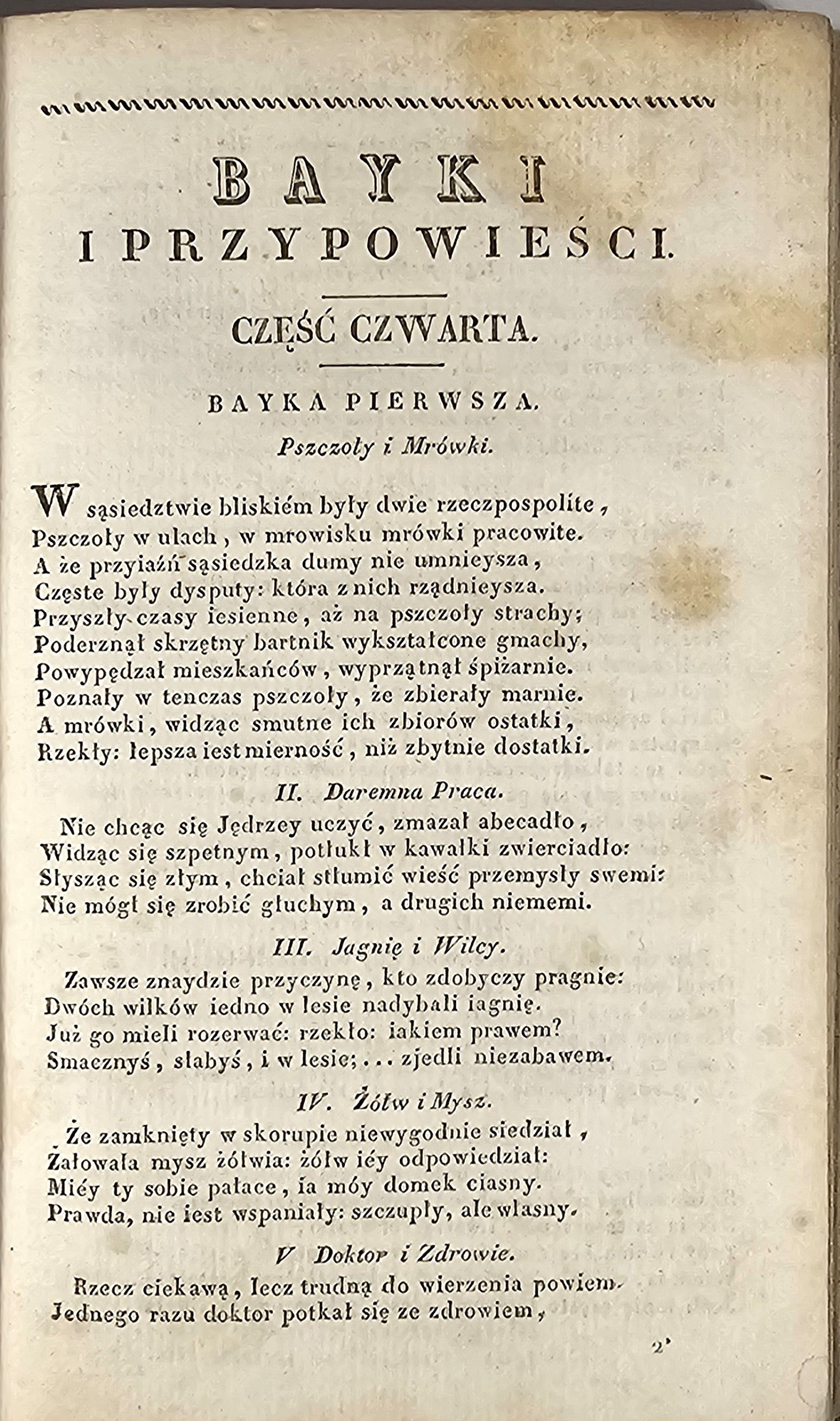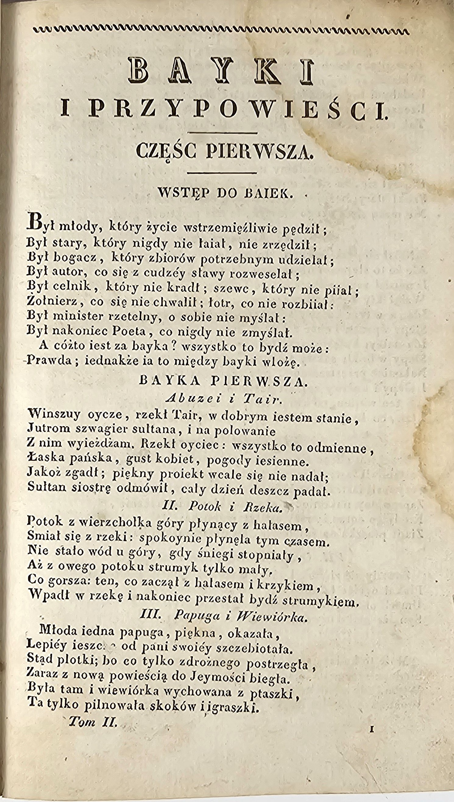 17 cm, s. 228, [4], opr. jedwabna z epoki. Oprawa nieznacznie podniszczona, cześć kart ze śladami zalania i zabrązowień (zwłaszcza na 2 kartach). T. II zawiera: Bayki i przypowieści, Bayki nowe, Satyry, Listy, Wiersze różne.