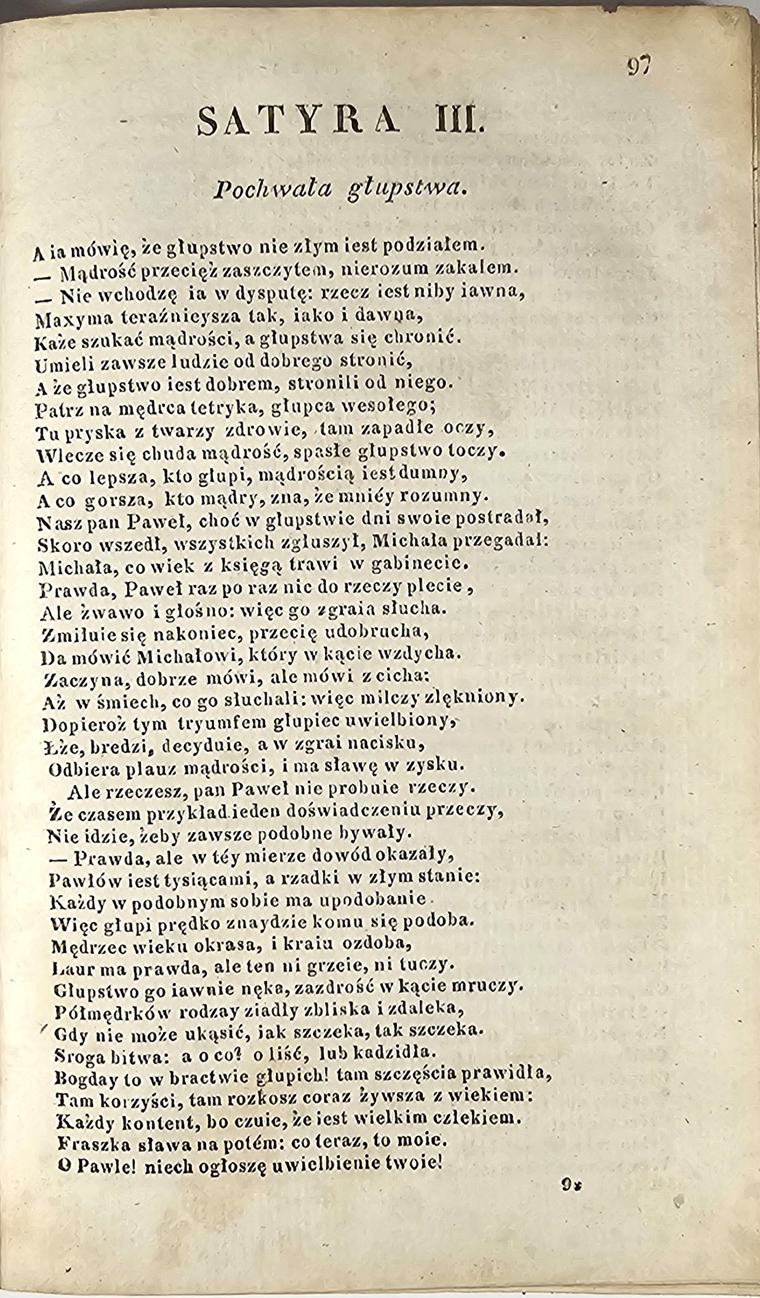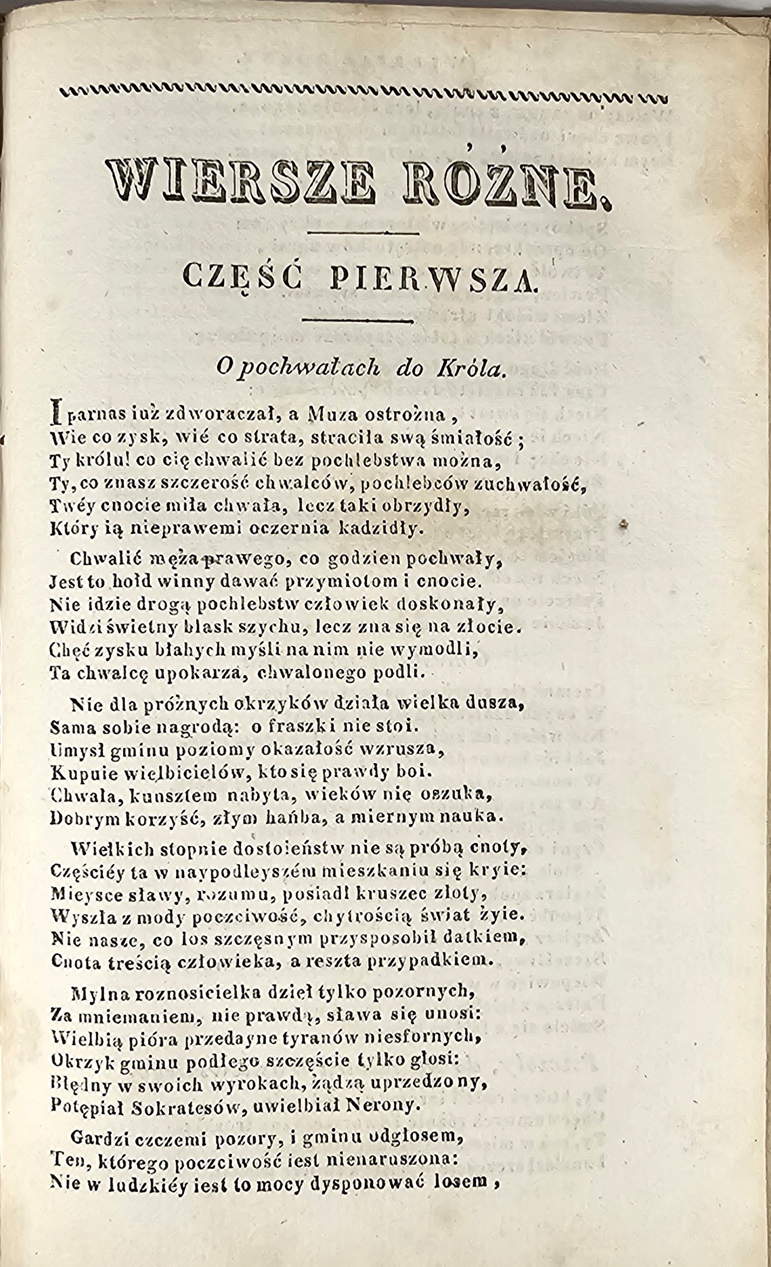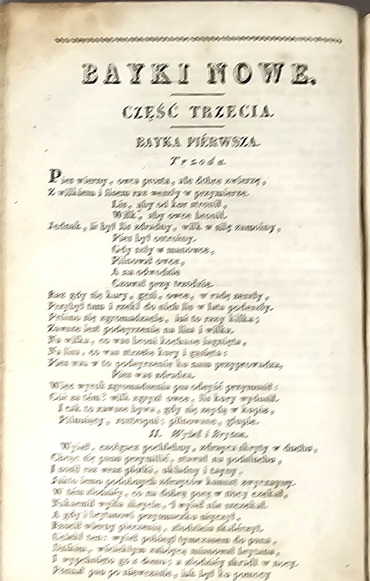17 cm, s. 228, [4], opr. jedwabna z epoki. Oprawa nieznacznie podniszczona, cześć kart ze śladami zalania i zabrązowień (zwłaszcza na 2 kartach). T. II zawiera: Bayki i przypowieści, Bayki nowe, Satyry, Listy, Wiersze różne.