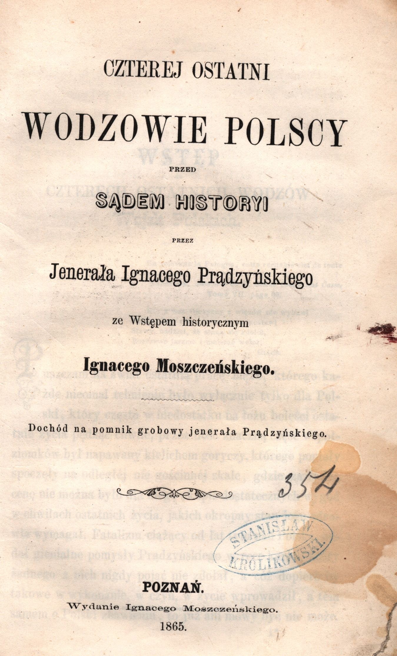 Poznań 1865/ Wydanie Ignacego Moszczeńskiego/ wydanie drugie/ półpłócienna oprawa introligatorska/ s.90/ portret autora na frontyspisie/ stan dobry-, ubytek rogów pierwszych trzech stron (w tym ilustracji), miejscami w tekście zaplamienia, pieczątka własnościowa na s.tyt.