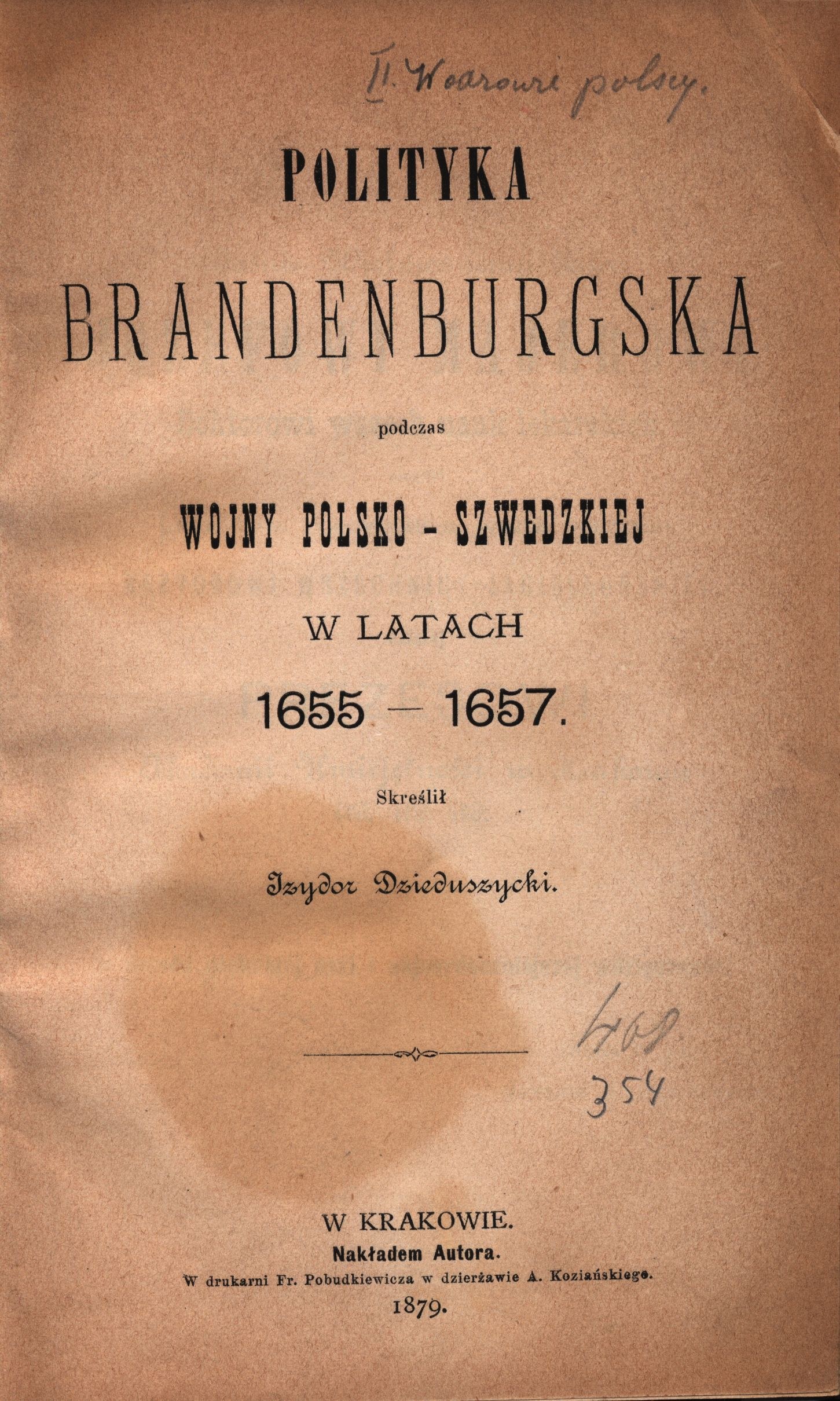 Dzieduszycki Izydor- Polityka brandenburgska podczas wojny polsko-szwedzkiej w latach 1655-1657/ Kraków 1879/ Nakładem Autora/ s.96.[4]/ stan dobry, miejscami zaplamienia, podklejenia ostatniej strony