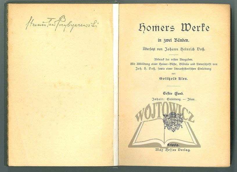 Ubersetzt von Johann Heinrich Voß. Abdruck der ersten Ausgaben. Mit Abbildung einer Homer-Büste, Bildnis und Unterschrift von Joh. H. Voß, sowie einer literarhistorischen Einleitung von Gotthold Klee. T. 1-2 w 1 vol. T. 1: Einleitung - Ilias. T. 2: Odyssee. Leipzig b. r. Max Hesses Verlag. 8 (mała), s. LIX, [1], 372; 290, 16, opr. pł. wydawn.
