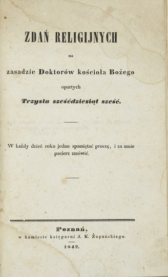 [oraz] BREZA Eugeniusz – Zdań religijnych na zasadzie Doktorów kościoła Bożego opartych trzysta sześćdziesiąt sześć. Poznań 1842. W komissie księg. J. K. Żupańskiego. 8, s. 31, [1]. razem opr. nieco późn. ppł.