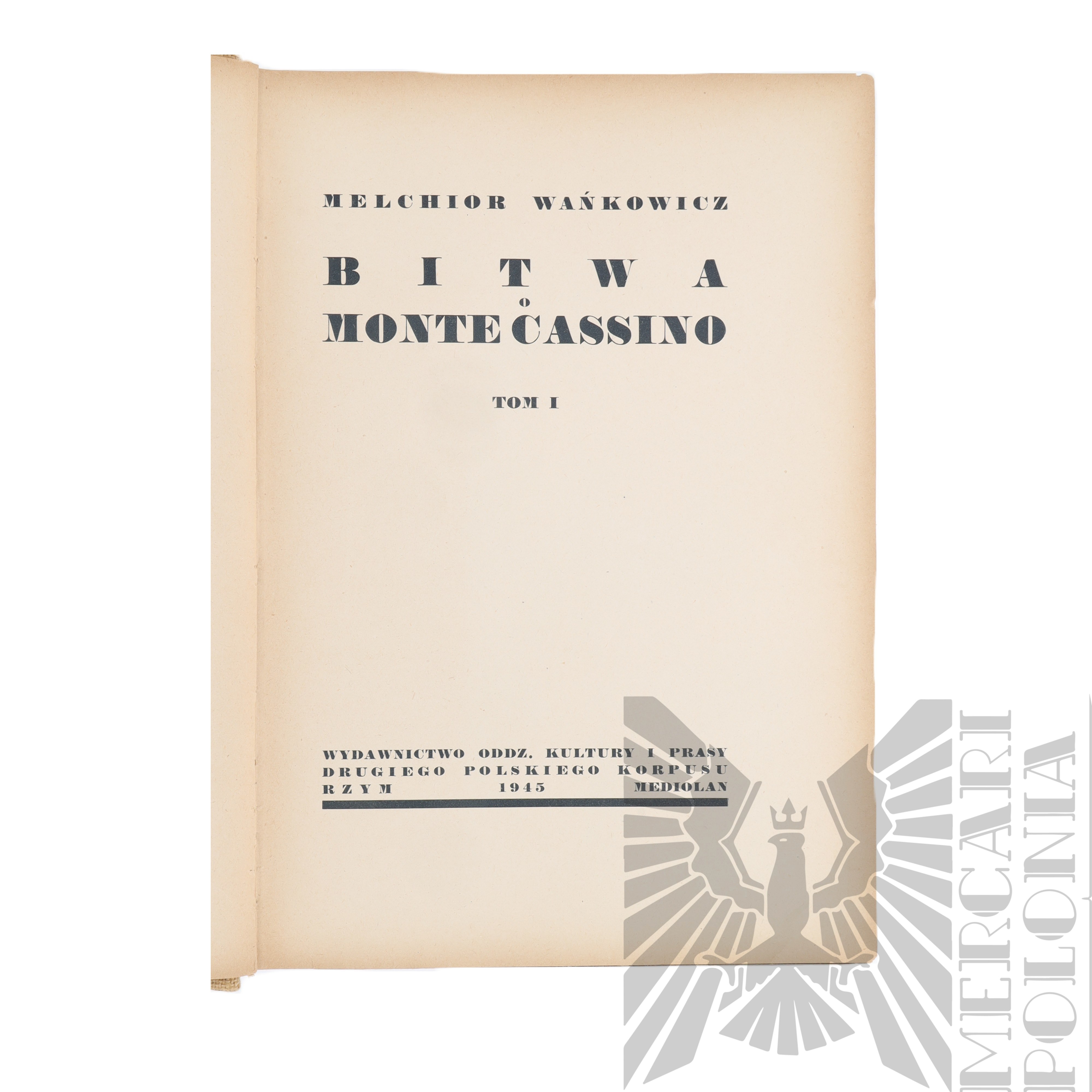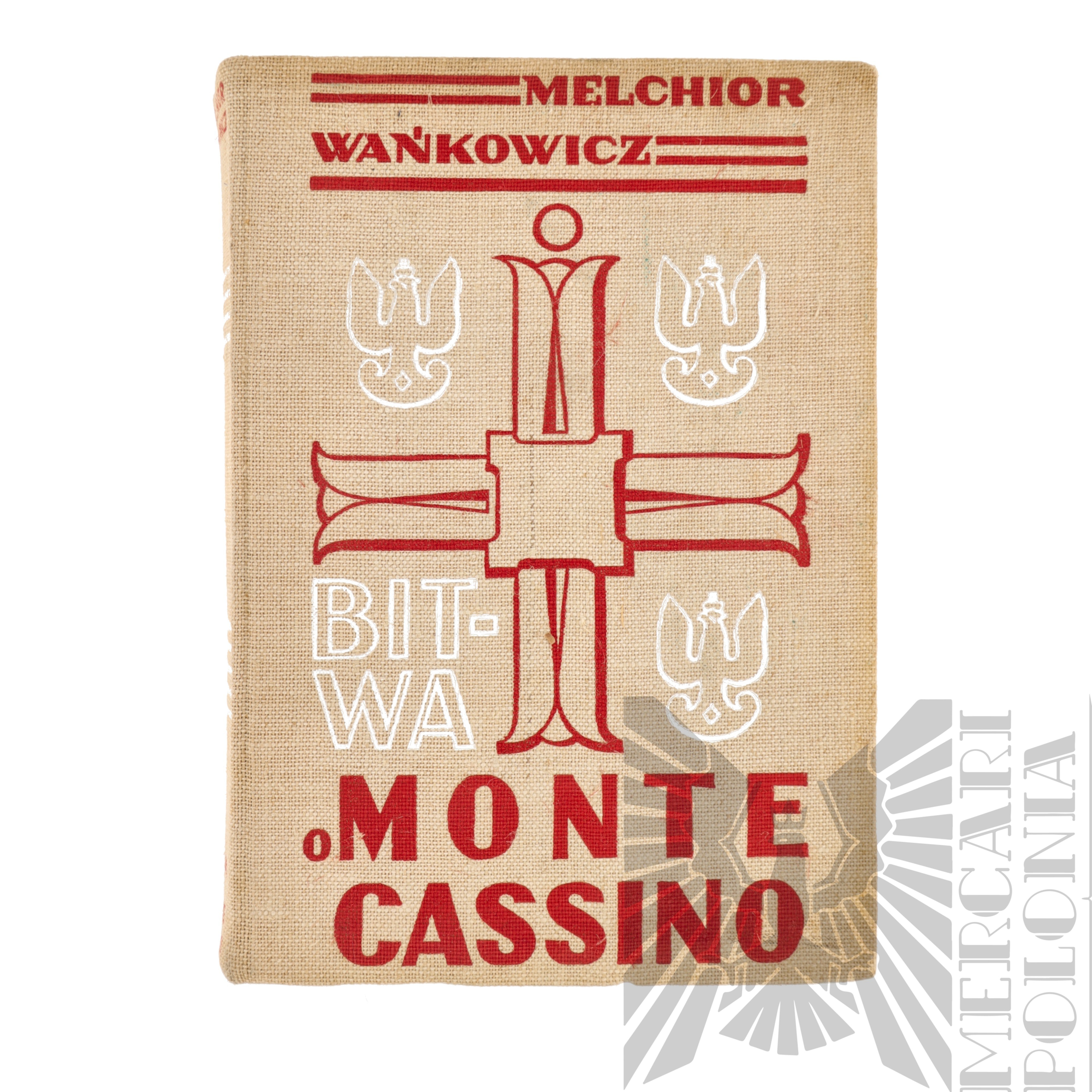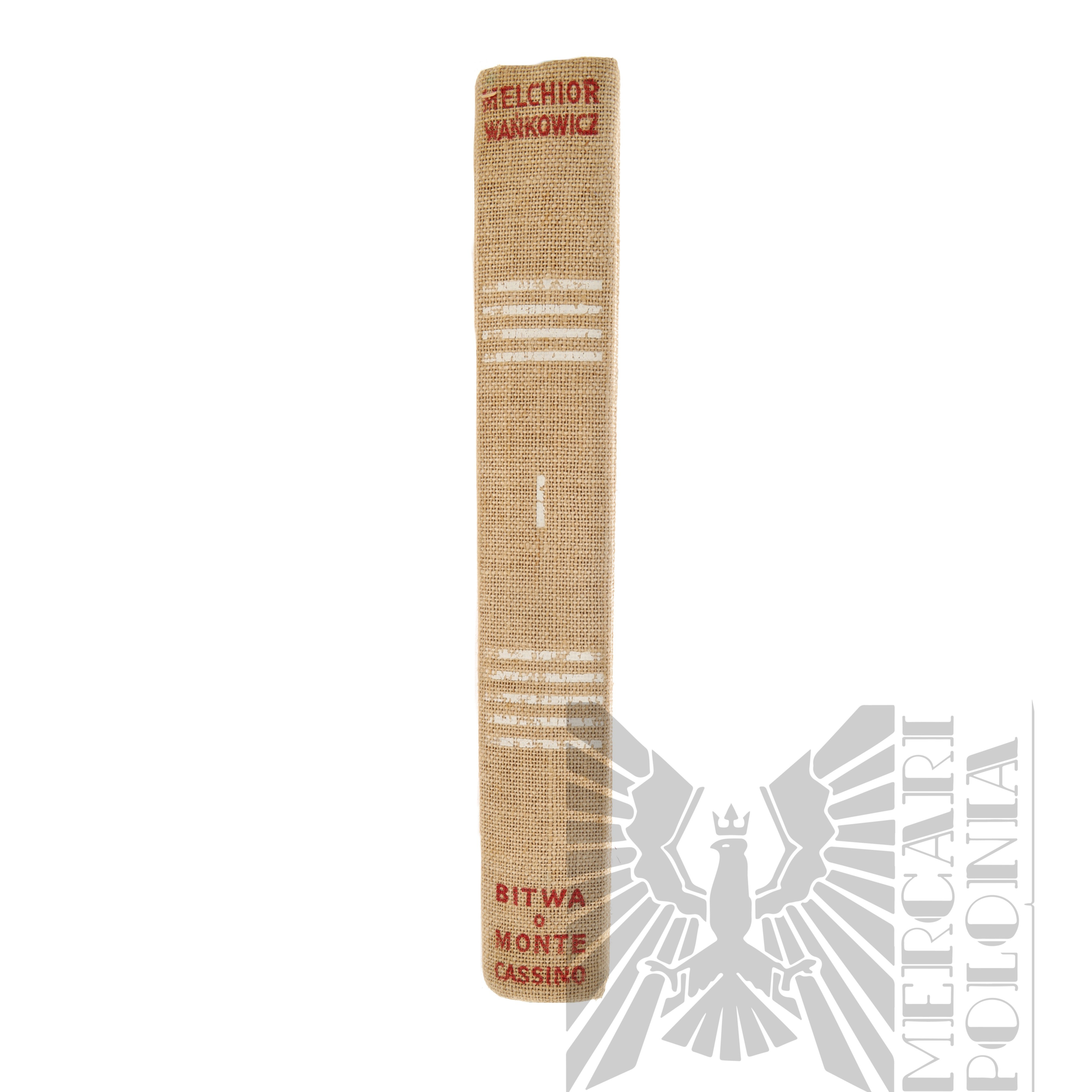 Książka Melchiora Wańkowicza pt. Bitwa o Monte Cassino. Tom I została wydana w 1945 roku w Rzymie i Mediolanie. Okładka twarda, płócienna, 447 stron.