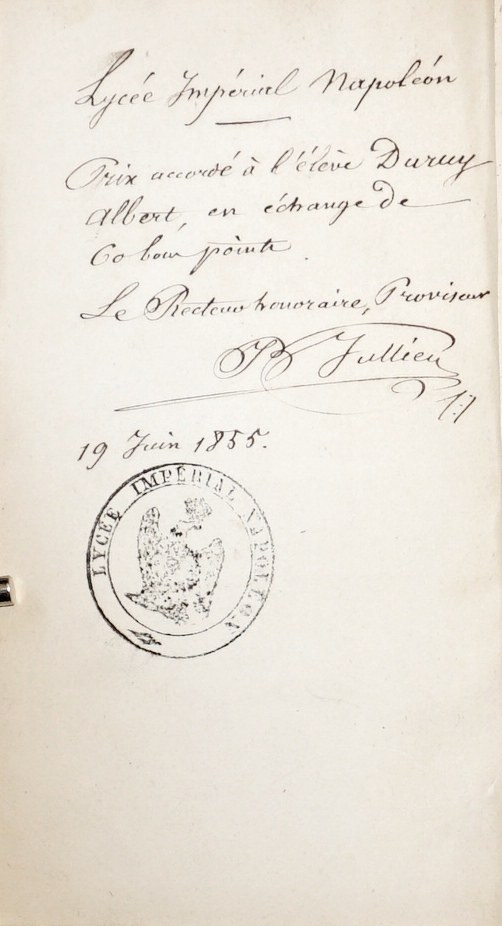[4], 284 s., 1 k. tablica rycina; oprawa pełna skóra z bardzo bogatymi tłoczeniami i złoceniami, superekslibris Lycee Imperial Napoleon, orzeł Napoleona, brzegi kart złocone, 18cm; stan dobry, otarcia oprawy, wpis na wyklejce jako nagroda z 1855;