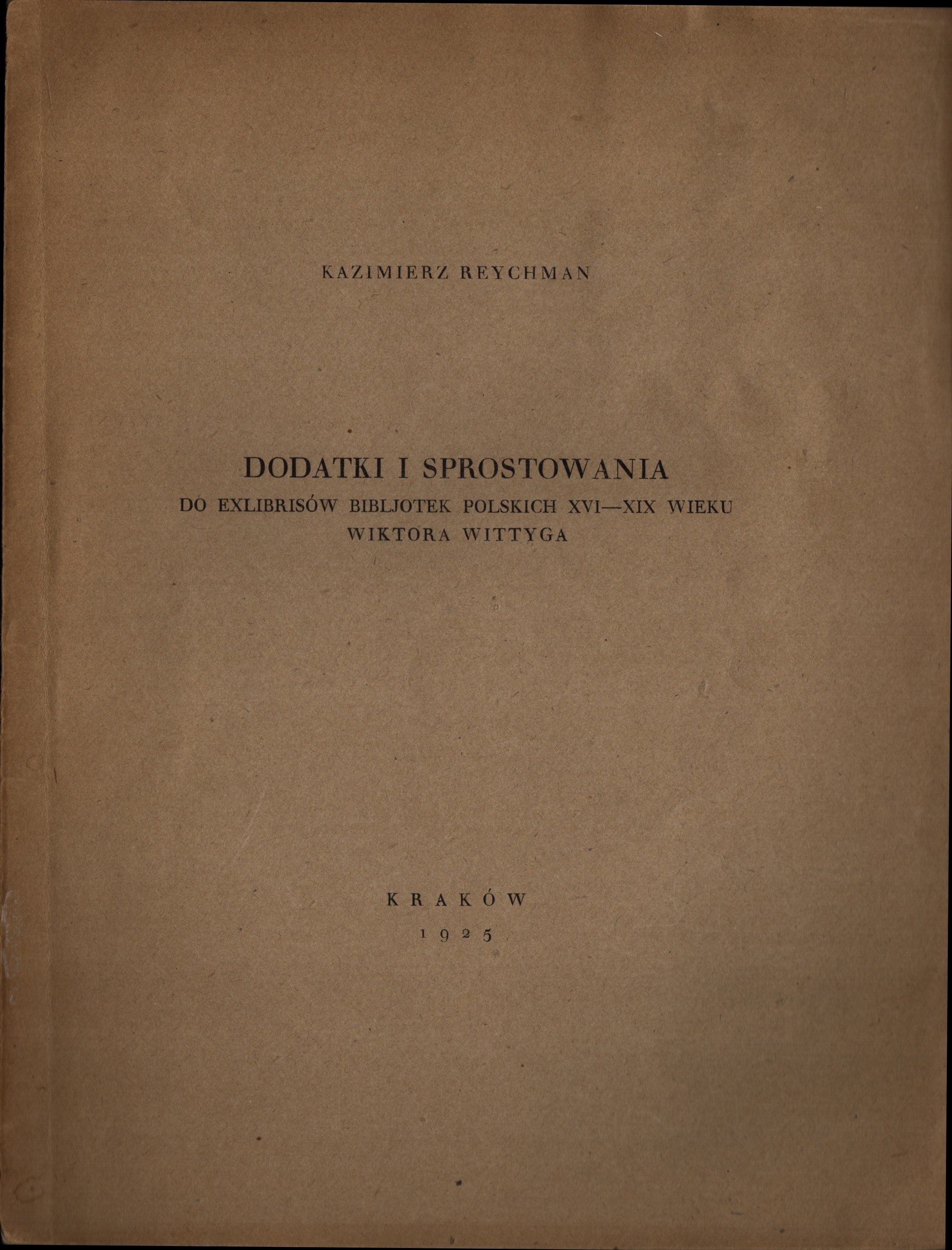 REYCHMAN Kazimierz - Dodatki i sprostowania do Exlibrisów Bibljotek Polskich XVI-XIX wieku Wiktora Wittyga. Kraków 1925.