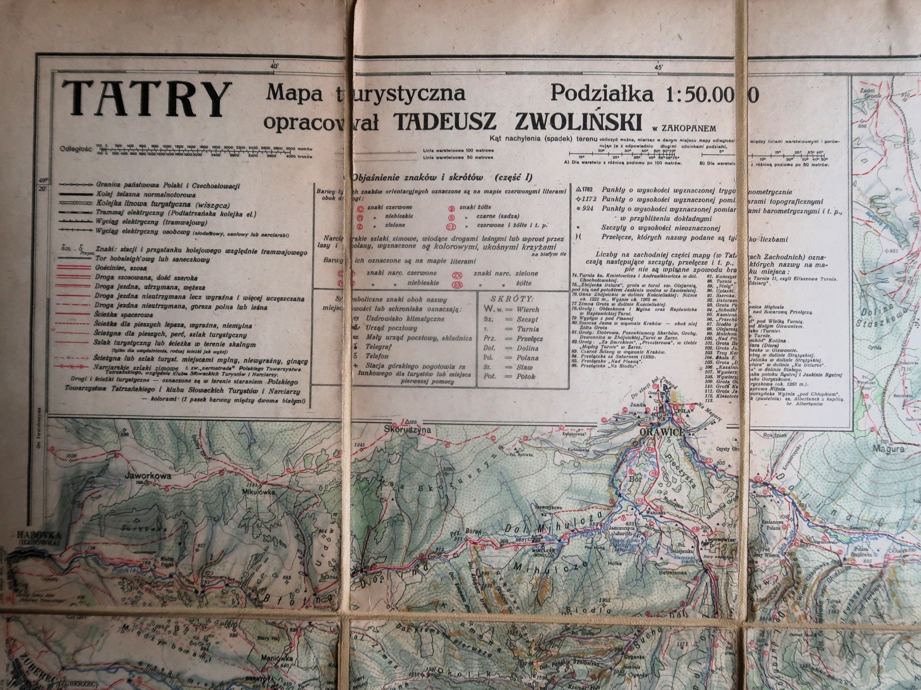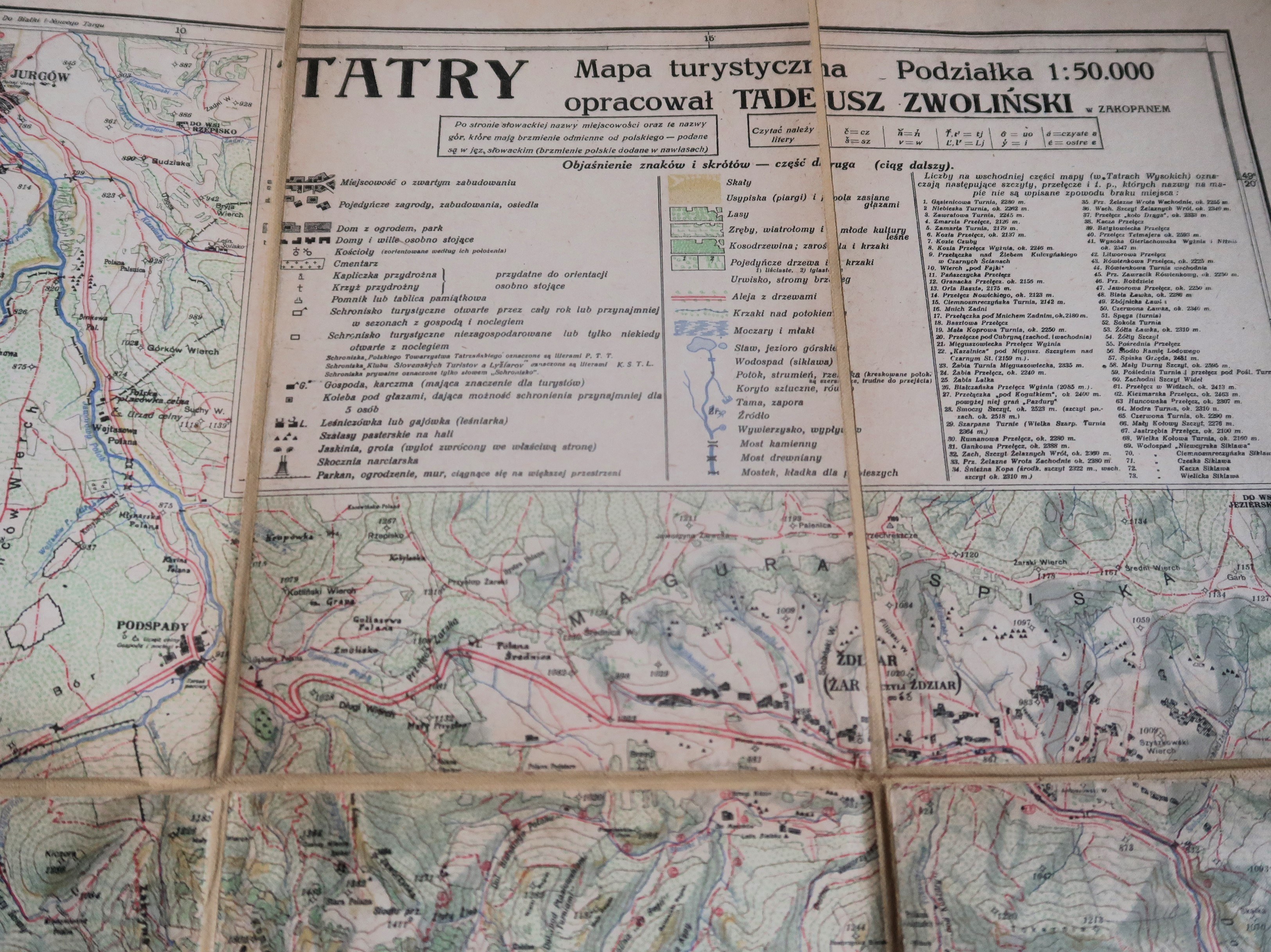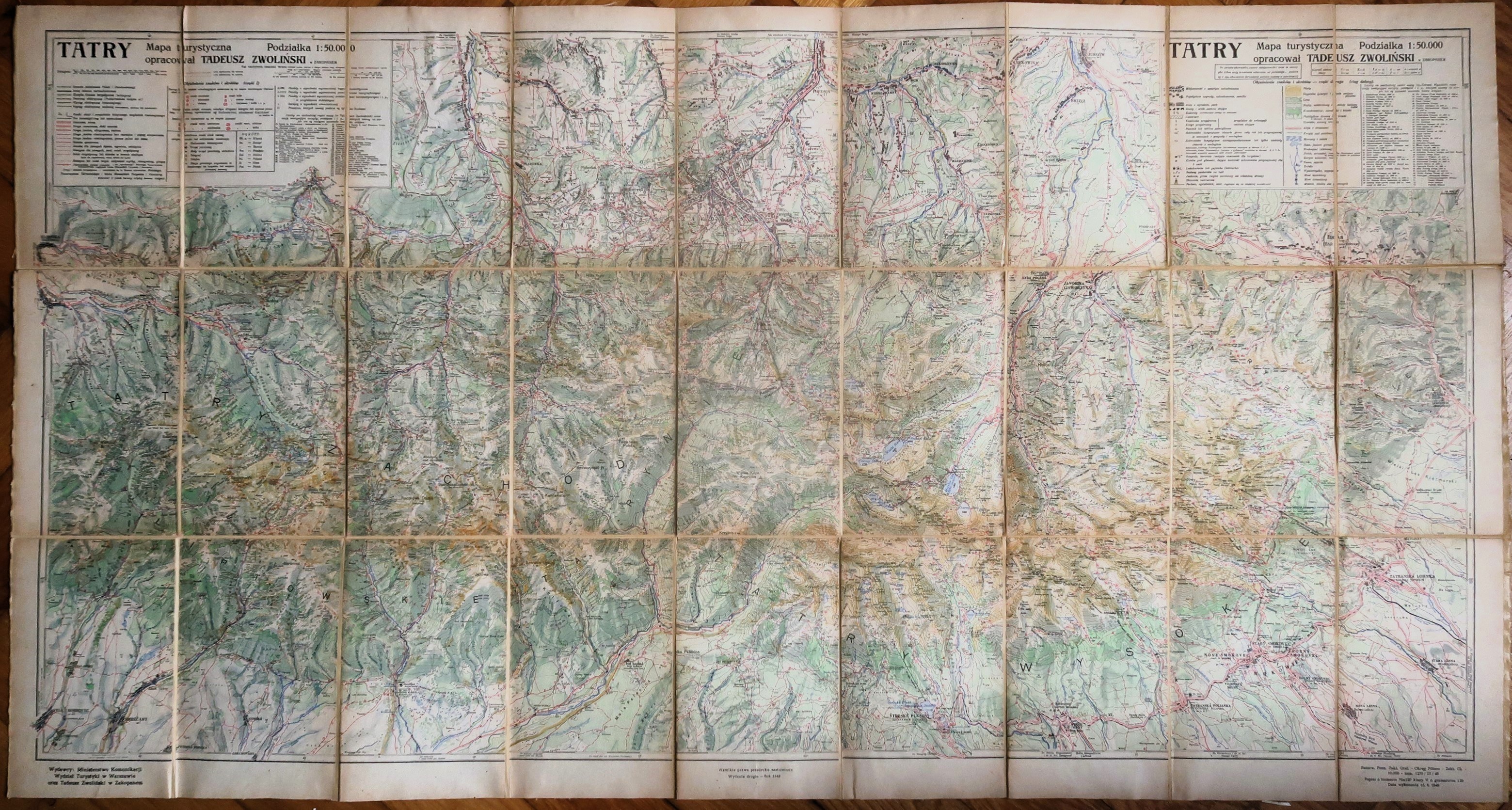 Wydanie drugie, 1948. Wydawcy : Ministerstwo Komunikacji wydział Turystki w Warszawie oraz Tadeusz Zwoliński w Zakopanem. Druk. Państwowe Poznańskie Zakłady Graficzne - Okręg Północ - Zakł. Gł. Wym. 107 x 58. Mapa podklejona na płótnie. Klasyczne ślady używania, stan dobry.