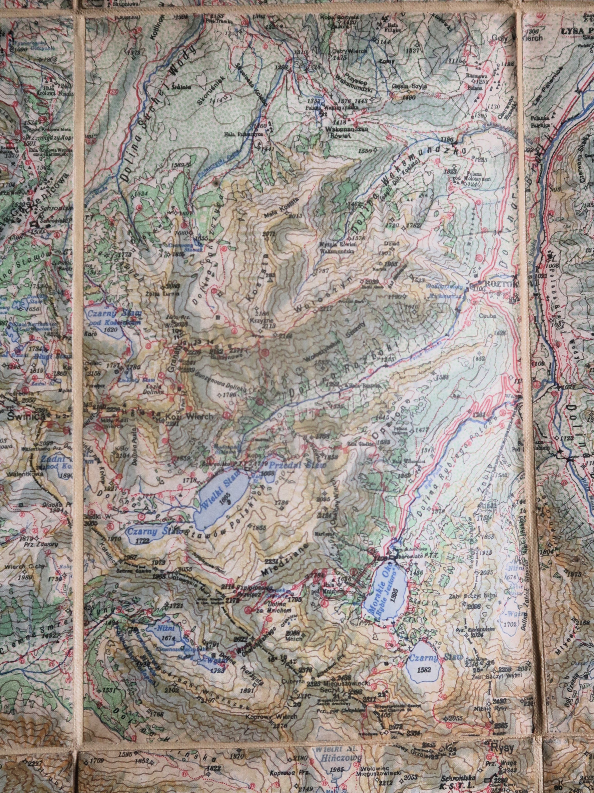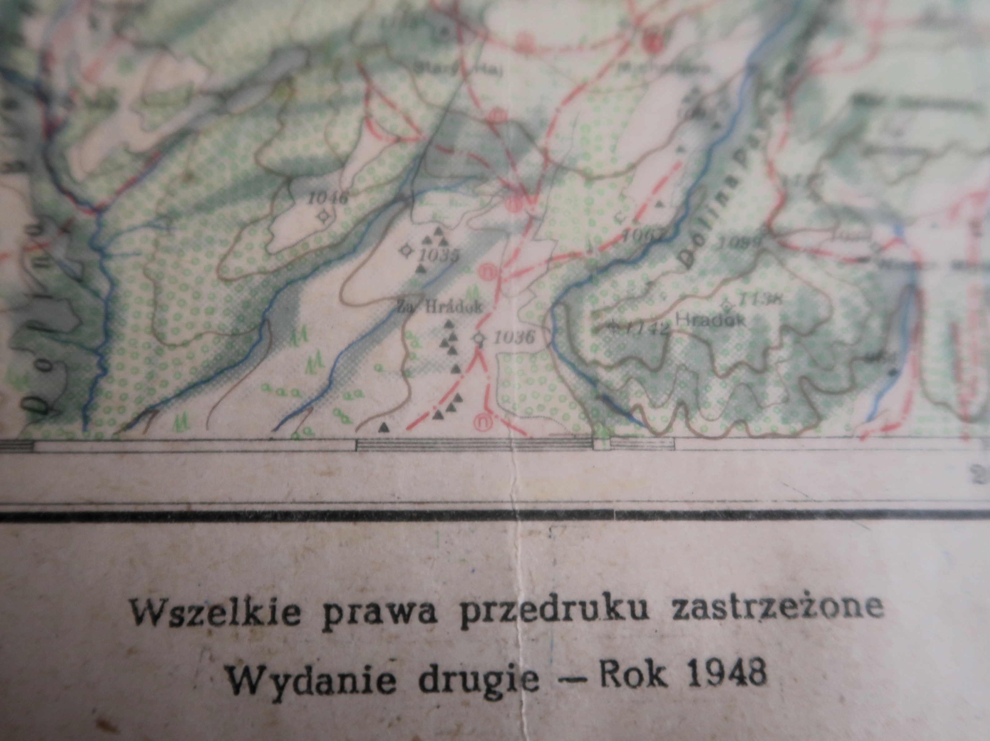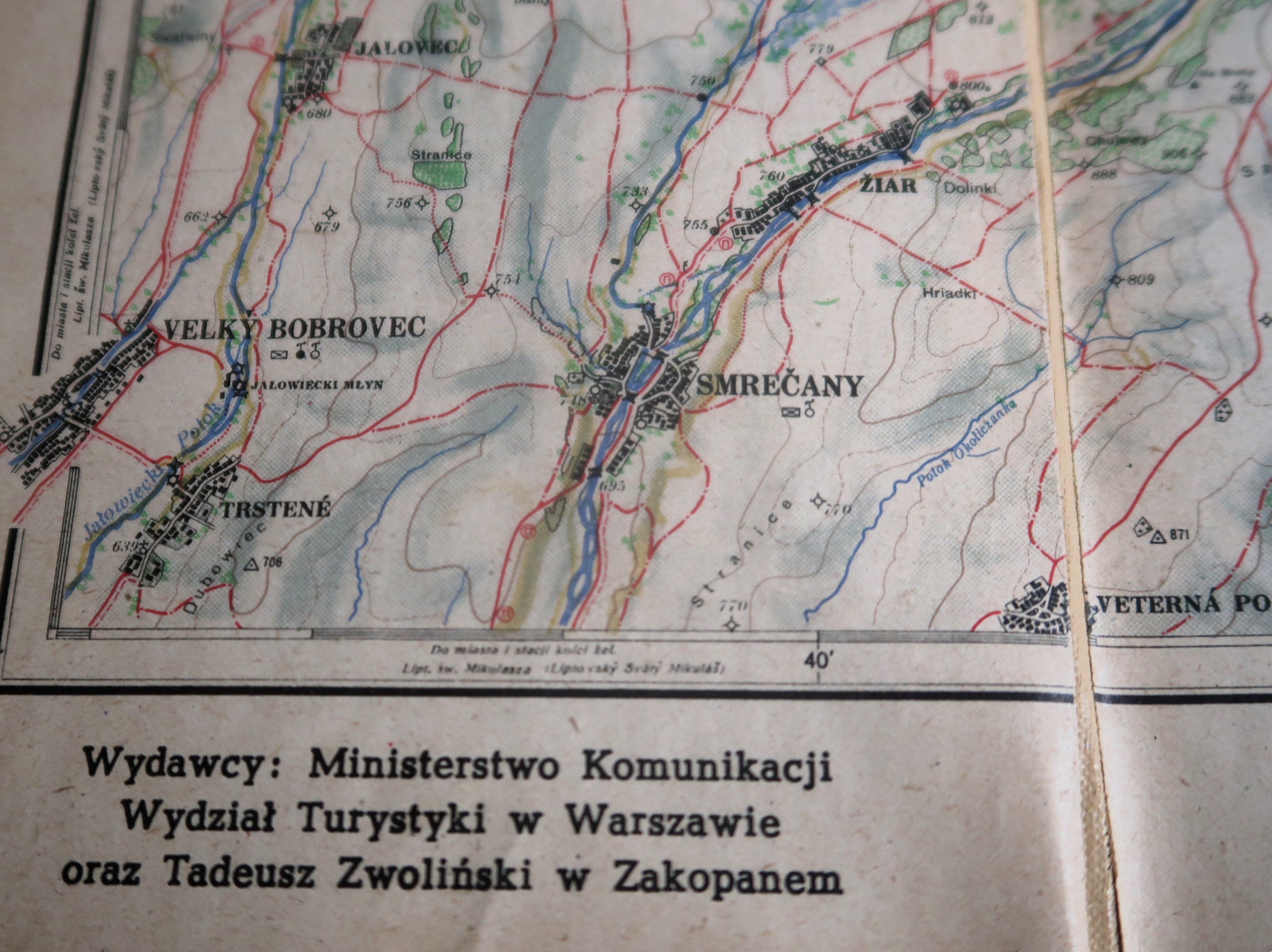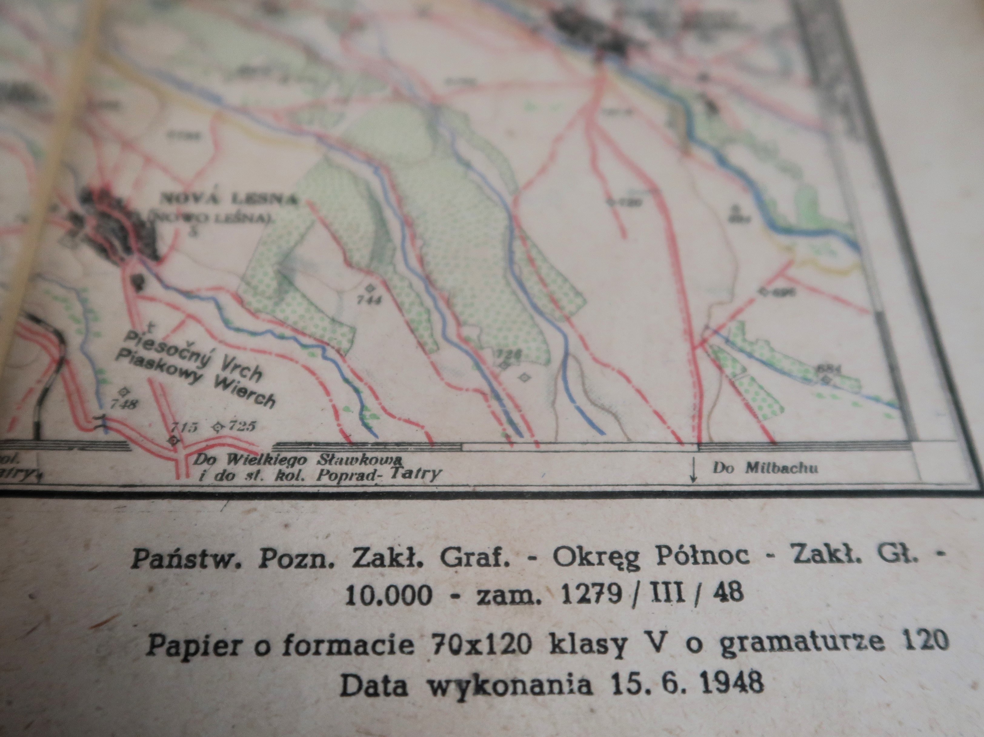 Wydanie drugie, 1948. Wydawcy : Ministerstwo Komunikacji wydział Turystki w Warszawie oraz Tadeusz Zwoliński w Zakopanem. Druk. Państwowe Poznańskie Zakłady Graficzne - Okręg Północ - Zakł. Gł. Wym. 107 x 58. Mapa podklejona na płótnie. Klasyczne ślady używania, stan dobry.