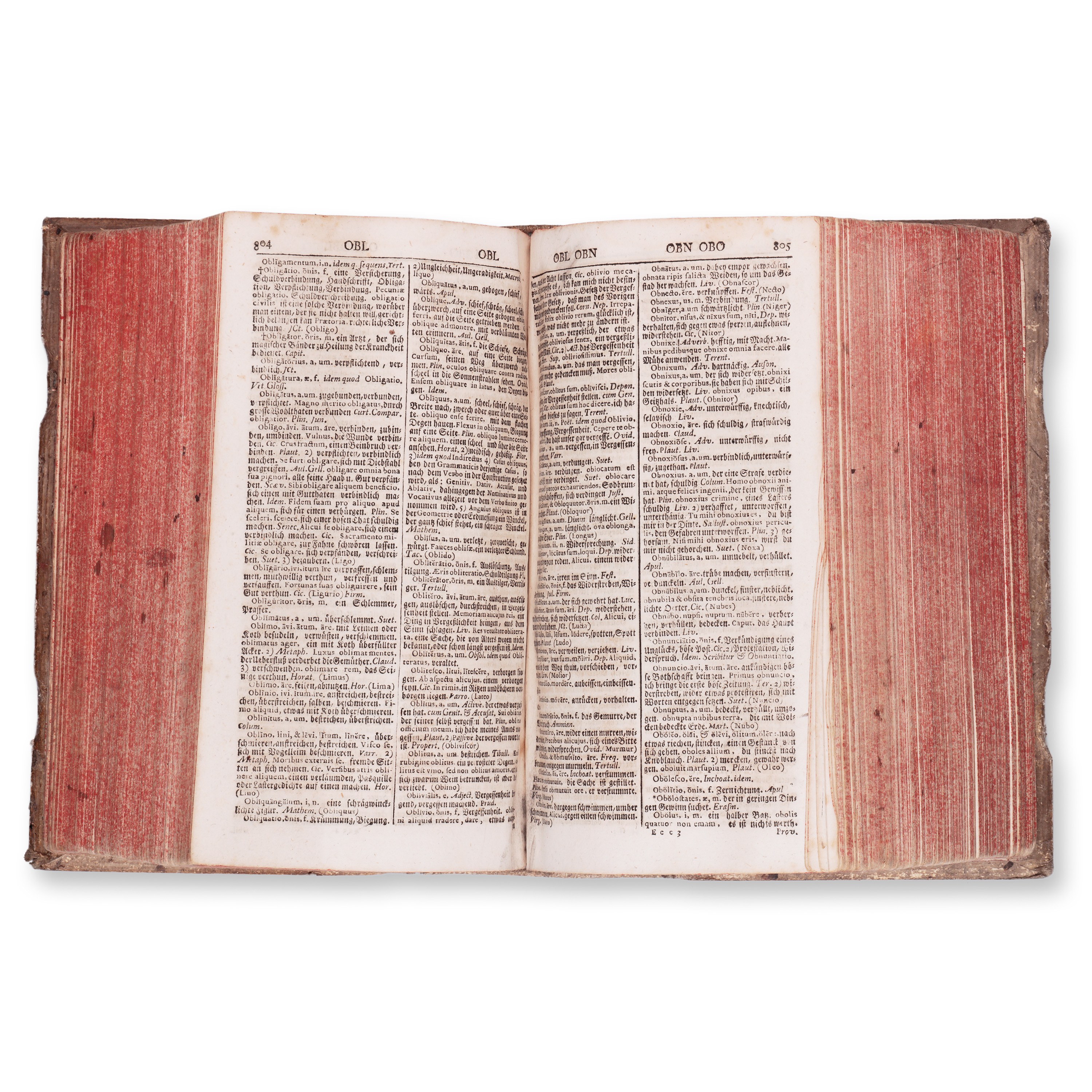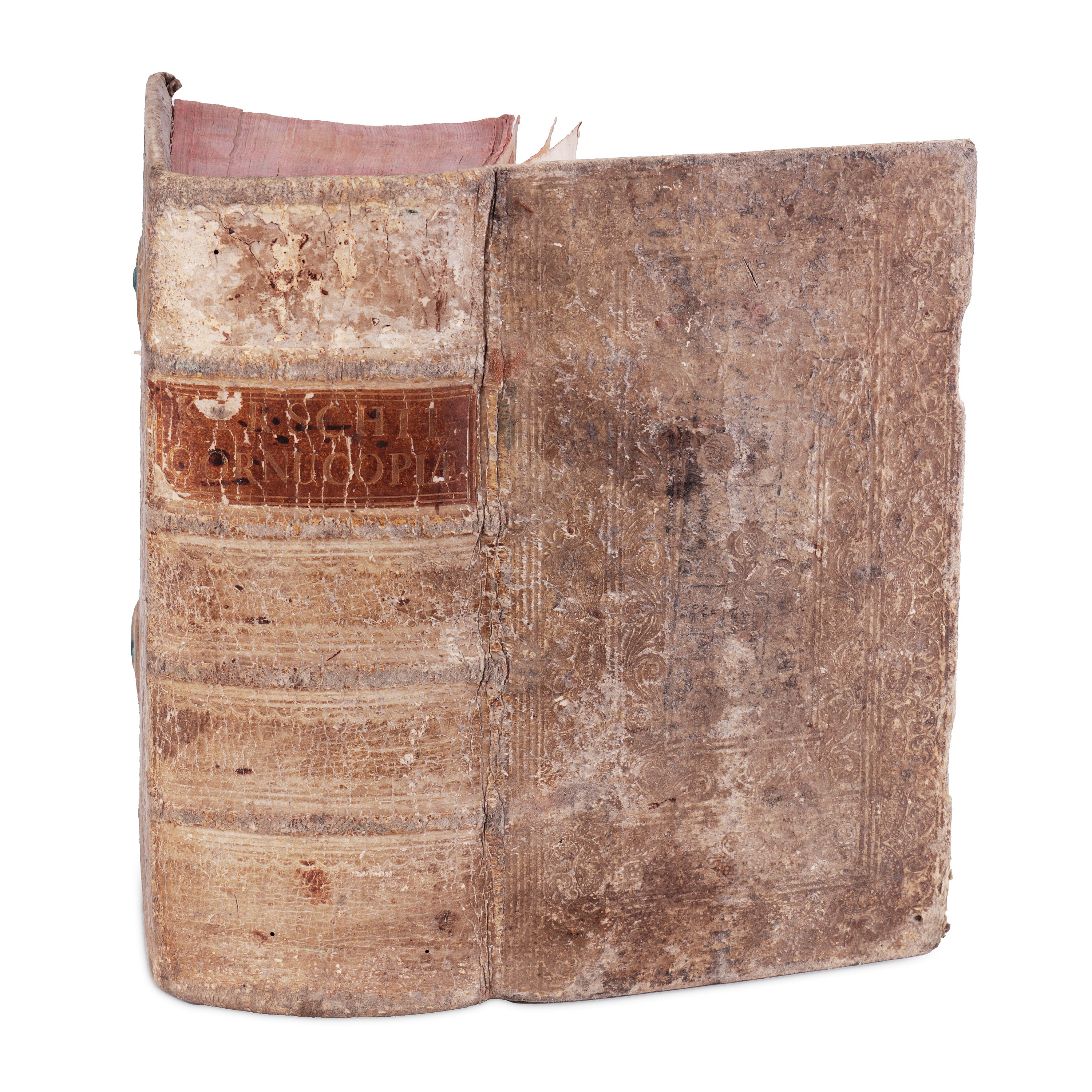 1750 | PUBLISHER: Ratisbonae et Viennae, Sumtibus Emerici Felicis Baderi | NUMBER OF PAGES: 444 + index | LANGUAGE: Latin, German | DIMENSIONS: 230 x 140 mm | THE FULL TITLE OF THE WORK: Abundantissimum cornucopiae linguae Latinae et Germanicae selectum: in quo continentur vocabula Latina omnis aevi, antiqui, medii ac novi ... similiter deorum, dearum, gentium, regnorum, regionum, urbium, marium, fluviorum, insularum, montium, animalium, arborum, herbarum, florum, et mineralium nomina ... cui adjunguntur in fine calendarium Romanum, Pantaleontis Bartelonaei Raverini in prosodiae speciales regulas epitome ... dein tabula alphabetica characterum Latinorum et in codicibus MSStis secundum secula; tum specimen scripturae veteris et ad postremum appendix regionum, urbium, montium et fluviorum | CONDITION: both edge clasps are missing, insect damage, sealing wax remains on the endpaper, damp stains, inscriptions