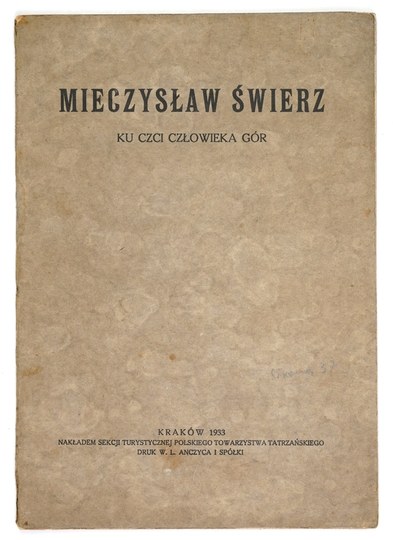 [ŚWIERZ Mieczysław]. Mieczysław Świerz. Ku czci człowieka gór. (Praca zbiorowa). Kraków 1933. Sekcja Turystyczna Polskiego Tow. Tatrzańskiego. 8, s. 54, [2], tabl. 2. brosz.