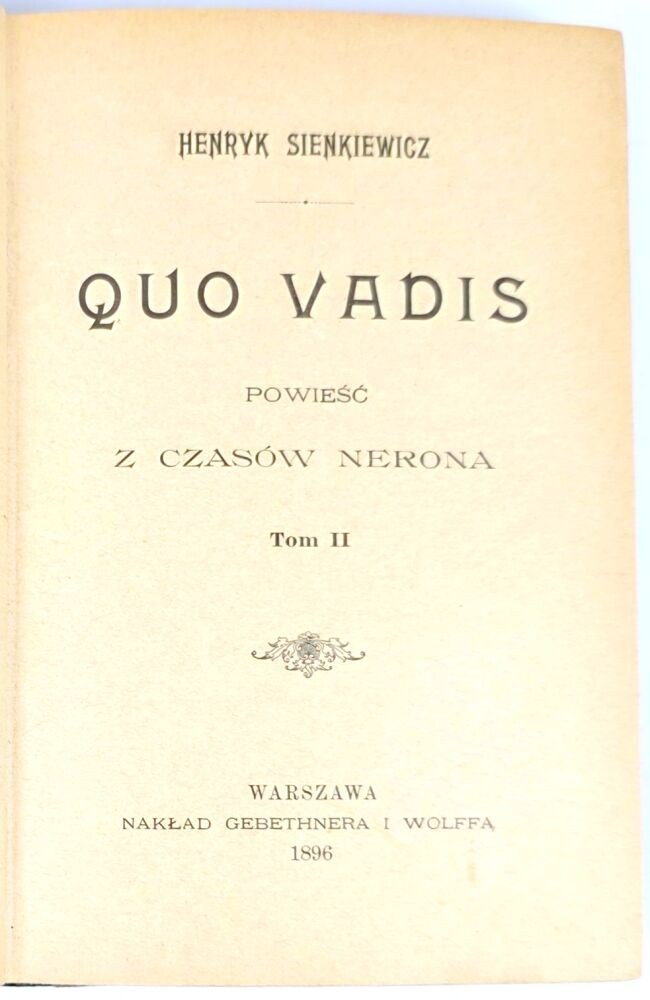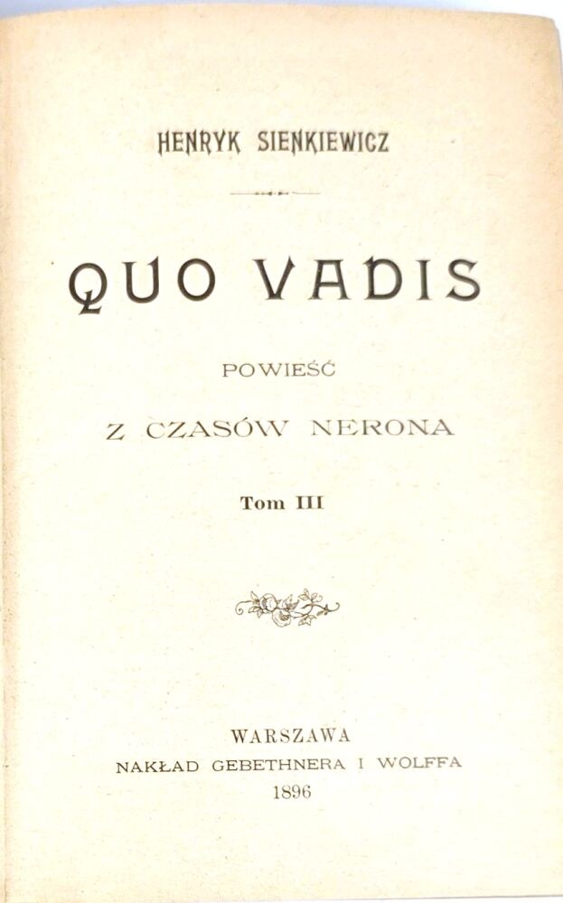"Najpierw była publikowana w odcinkach w warszawskiej "Gazecie Polskiej" (lata 1895–96) i, z minimalnym opóźnieniem w stosunku do "Gazety", także w krakowskim dzienniku "Czas" i "Dzienniku Poznańskim". Wkrótce powieść została wydana w formie druku zwartego – jej premiera odbyła się w Krakowie, w 1896 roku. Powieść odniosła światowy sukces i została przetłumaczona na ponad pięćdziesiąt języków". źródło: wikipedia.org.
