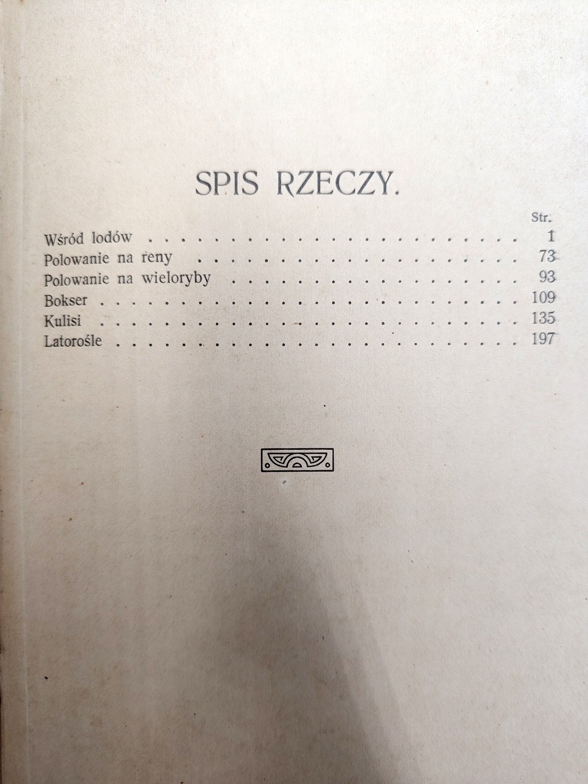 Zawiera : Wśród lodów, Polowanie na reny, Polowanie na wieloryby, Bokser, Kulisi, Latorośle.