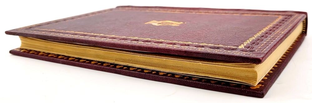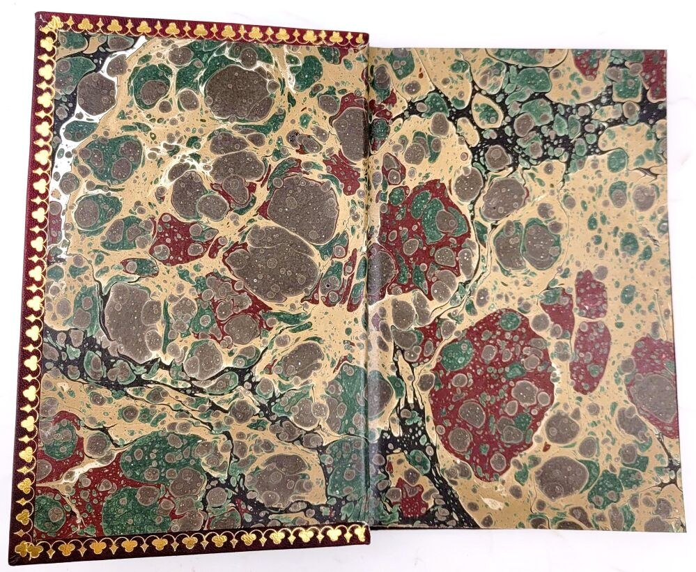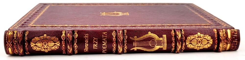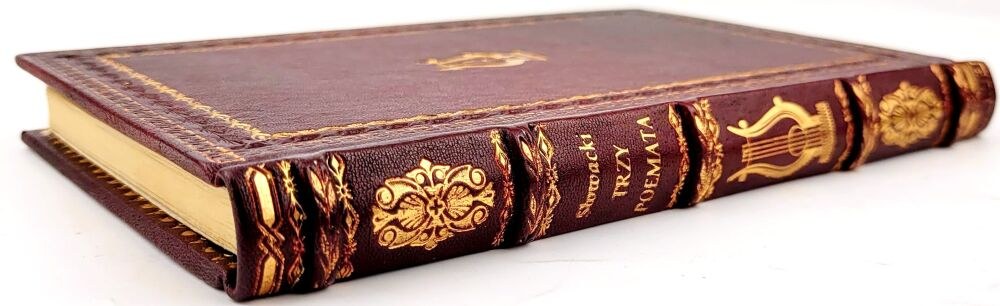 TWARDA OPRAWA PEŁNA SKÓRA WSPÓŁCZESNA OZDOBNA, NA LICACH OZDOBNA BORDIURA O CHARAKTERZE GEOMETRYCZNYM, W ZWIERCIADLE OKŁADEK MISTERNIE TŁOCZONYA HARFA, GRZBIET Z PODZIAŁEM NA POLA, WYPUKŁYMI ZWIĘZAMI, TŁOCZENIAMI I ZŁOCENIAMI, WYKLEJKI Z RĘCZNIE WYKONANEGO PAPIERU MARMORYZOWANEGO, OBCIĘCIA KART ZŁOCONE, WNĘTRZA OKŁADEK WYKOŃCZONE ZŁOTĄ ROLKĄ. OPRAWA NAWIĄZUJĄCA STYLISTYKĄ DO ZBYTKOWNYCH OPRAW Z EPOKI!