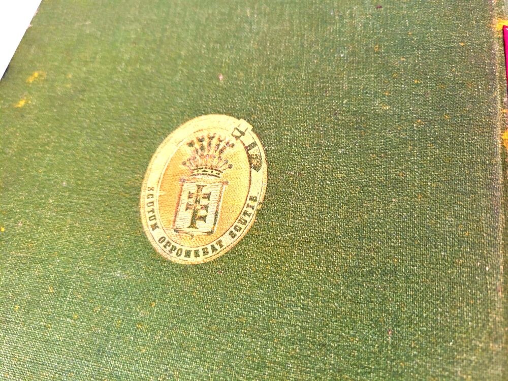 TWARDA OPRAWA PEŁNE PŁÓTNO Z EPOKI, SKÓRZANY SZAYLDZIK NA GRZBIECIE, NA TTLNIM LICU SUPEREKSLIBRIS Z HERBEM PILAWA POTOCKICH.