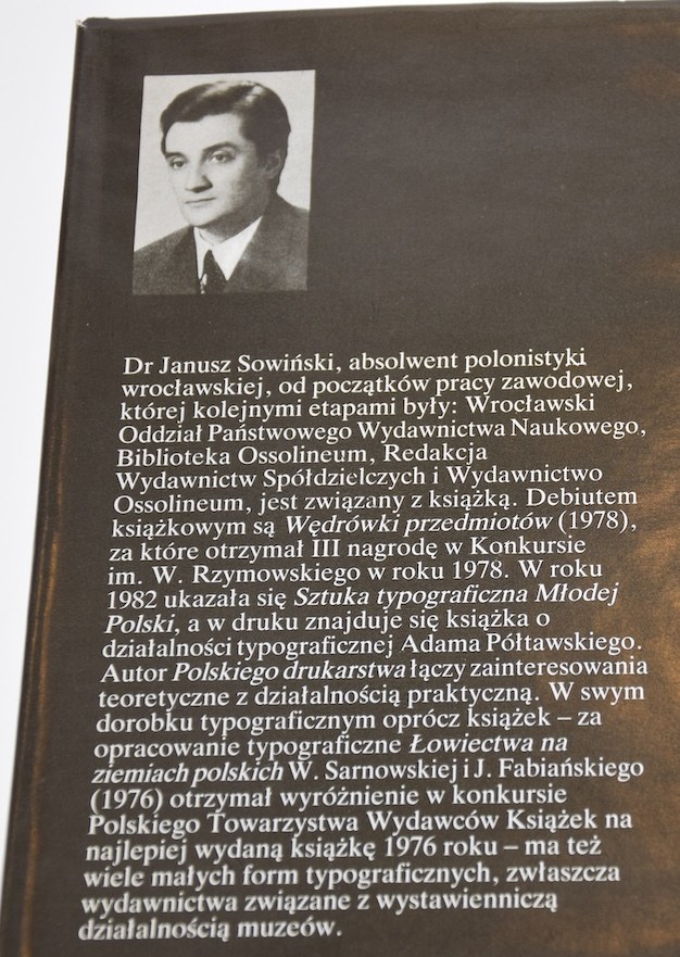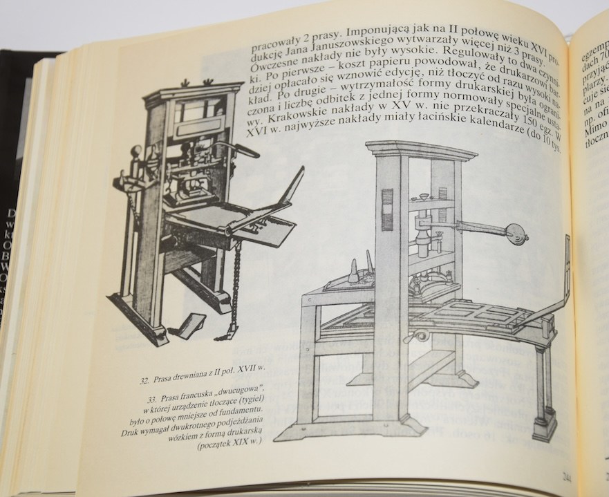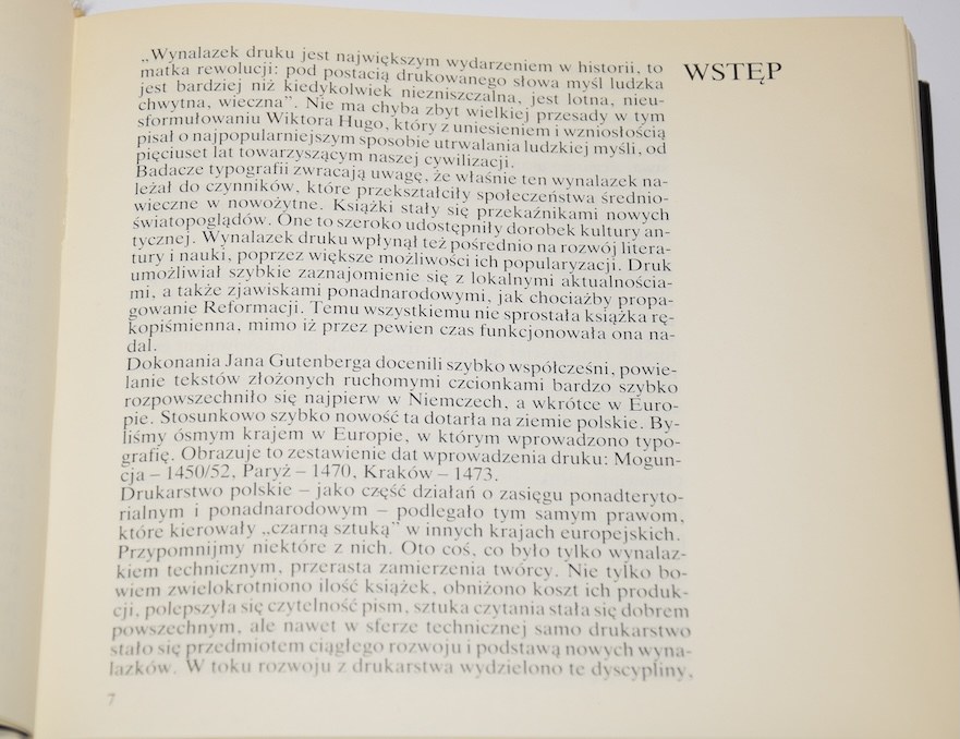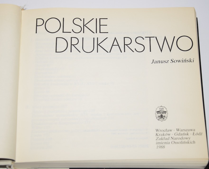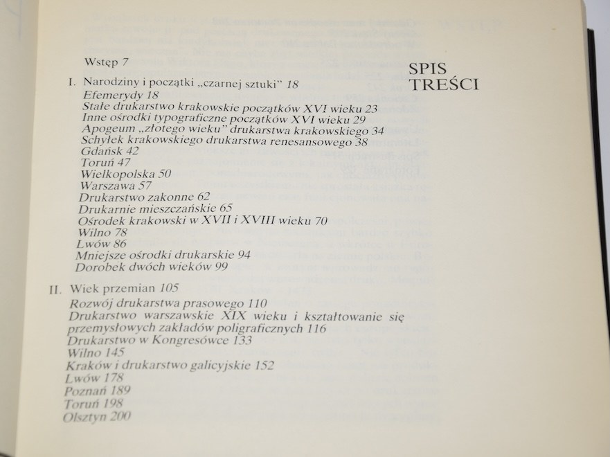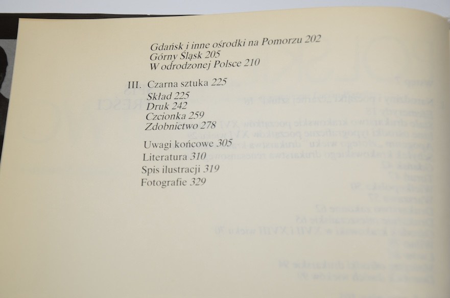 Zawiera m. in.: Stałe drukarstwo krakowskie początków XVI wieku, Ośrodki typograficzne początków XVI wieku, Mniejsze ośrodki drukarskie, Drukarstwo warszawskie XIX wieku i kształtowanie się przemysłowych zakładów poligraficznych, Drukarstwo w Kongresówce , Skład, Druk, Czcionka, Zdobnictwo, Bibliografia.