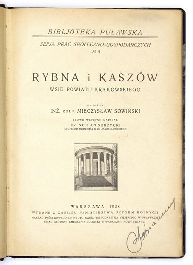 SOWIŃSKI Mieczysław - Rybna i Kaszów, wsie powiatu krakowskiego. Słowo wstępne napisał Stefan Surzycki. Warszawa 1928. Druk. L. Nowaka. 8, s. VII, [1], 208, tabl. 1. opr. bibliot. ppł. z epoki. Bibljot. Puławska, Serja Prac Społeczno-Gospodarczych, nr 5.