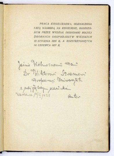 Stan dobry. Odręczna dedykacja autora dla prof. W. Szrama. Podpis własn. tegoż ("Schramm"). Skasowana piecz. bibliot., naklejka inwentarzowa. Praca zdobyła I nagrodę w konkursie Wydz. Ekonomiki Rolnej Drobnych Gospodarstw Wiejskich.