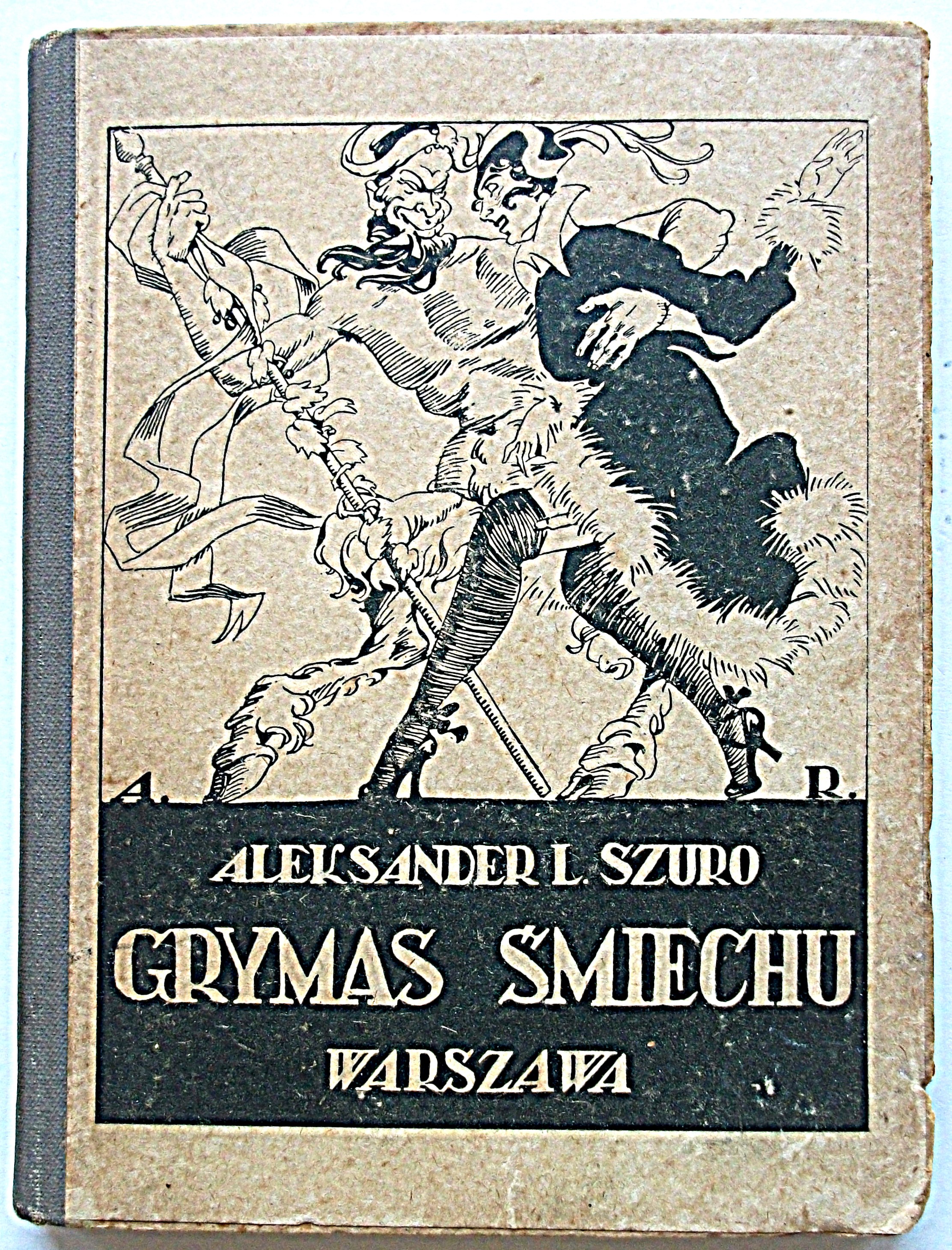 SZURO ALEKSANDER L. Grymas śmiechu. W-wa 1919. Drukarnia i introligatornia L. Nowak. Format 11/15 cm. s. 126, [2]. Opr., introlig. Ppłtn. Ciekawa graficznie wierzchnia okładka sygnowana ; A. R.