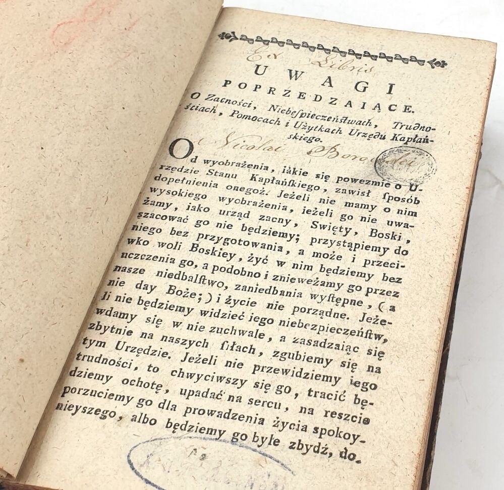 Z księgozbioru księdza Mikołaja Borowskiego [zm. 8.09.1834]- po tekście wpis własn., na grzbiecie złocony superexlibris w formie inicjałów X.M.B. Mikołaj Borowski - proboszcz (introdukcja 6 VIII 1793) do śmierci w Charłupi Wielkej, parafii pw. św. Bartłomieja Ap.