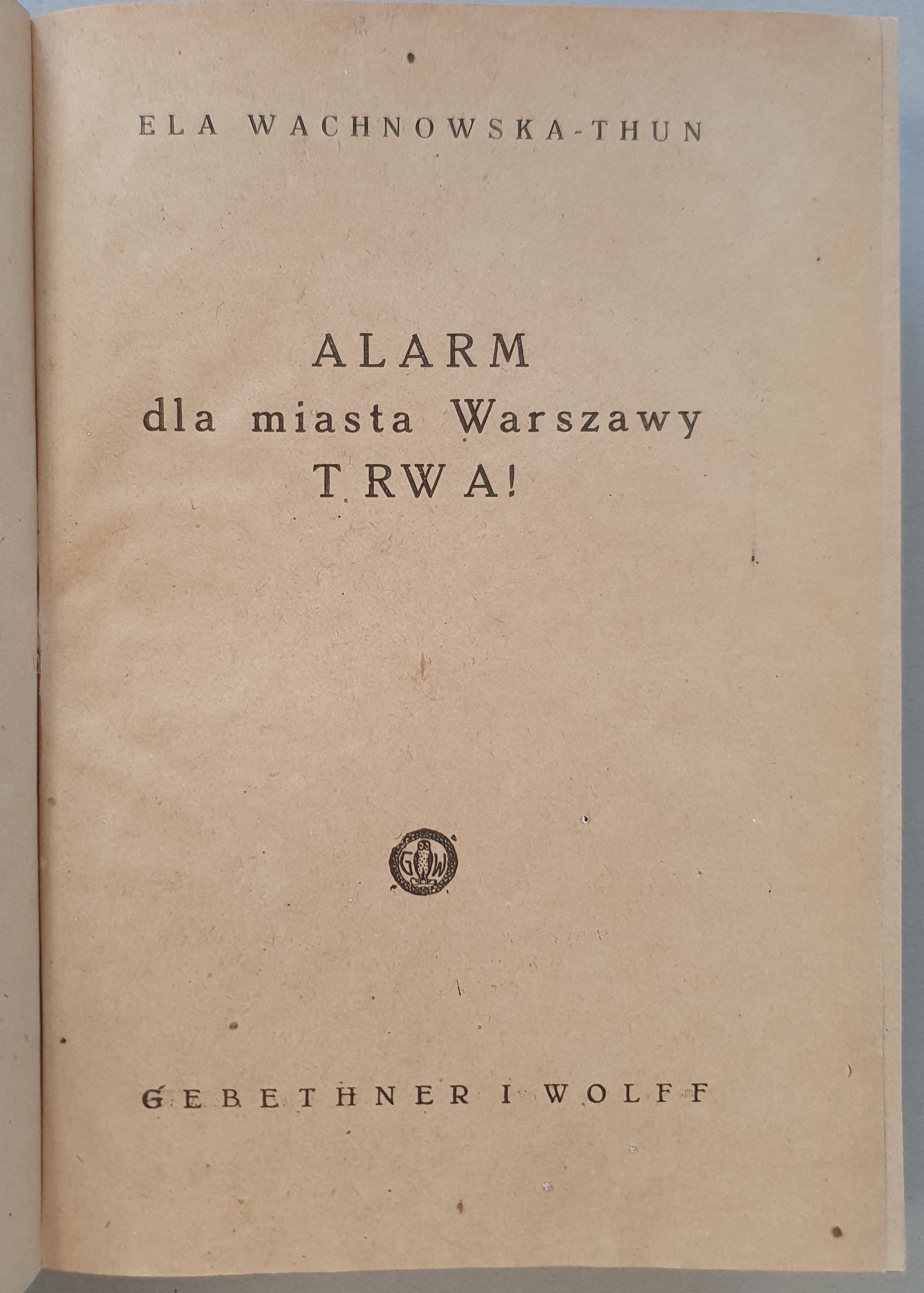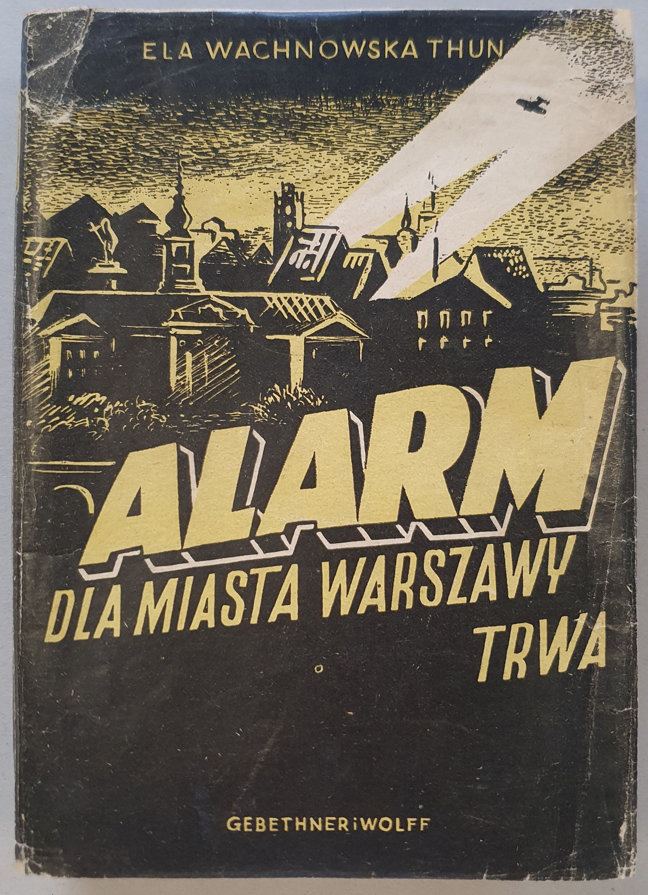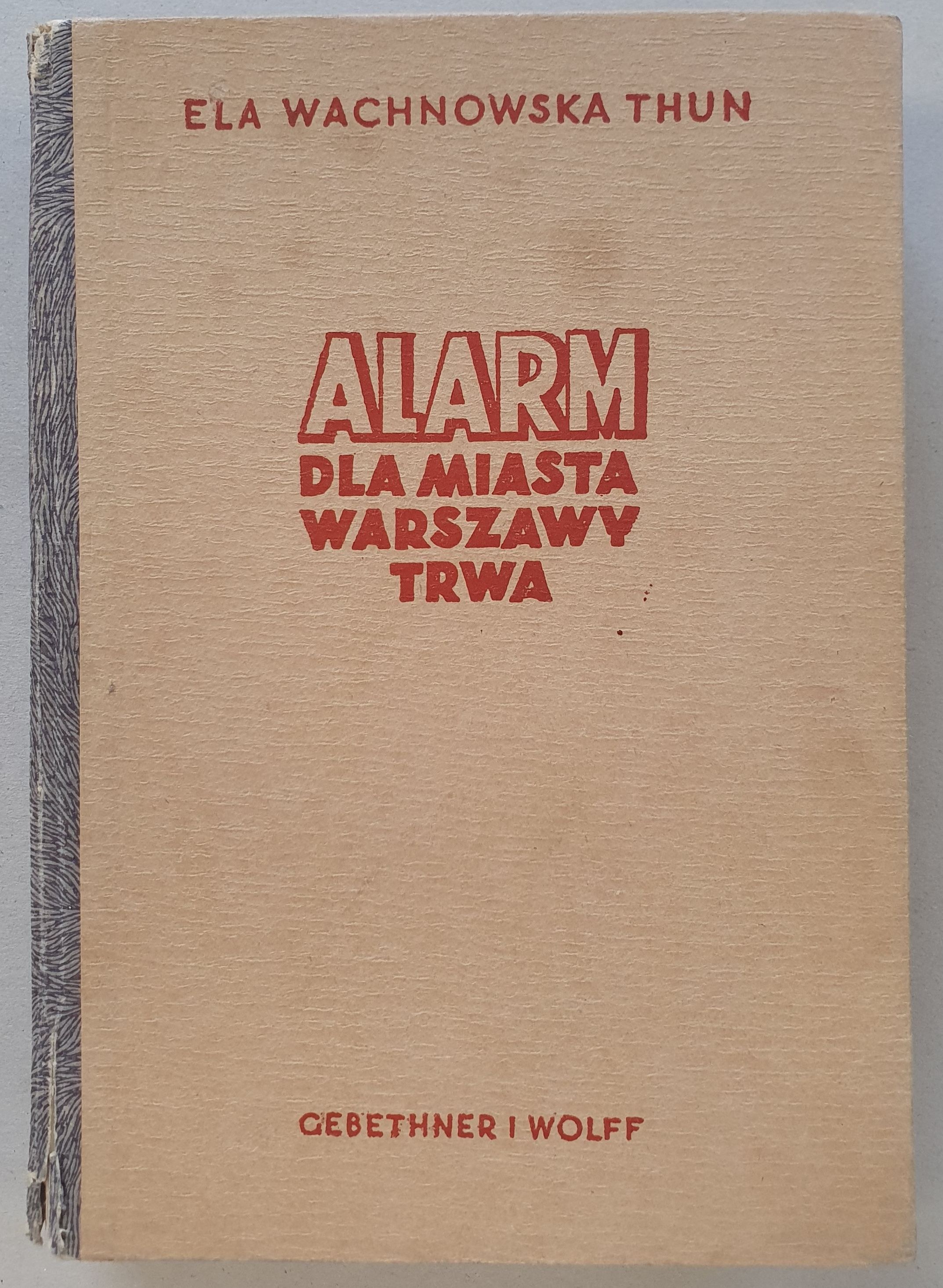 Wachnowska - Thun Ela - ALARM dla miasta Warszawy TRWA! Gebethner i Wolff, Drukarnia Państwowa Nr. 1 Warszawa.1946. Oprawa twarda z obwolutą, 640 s., 21 cm.