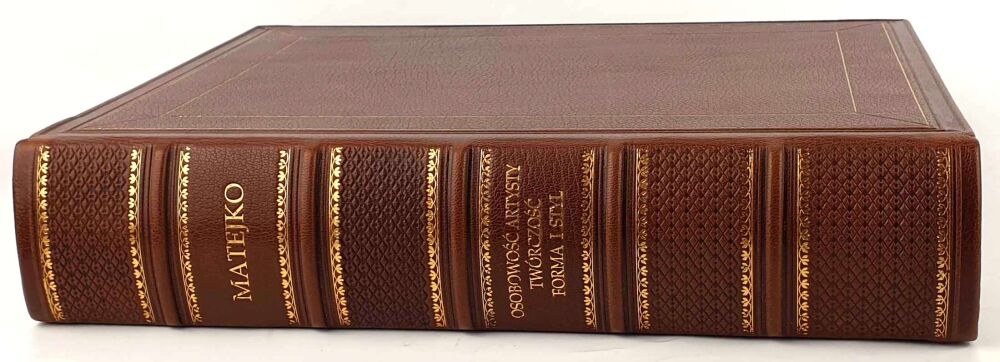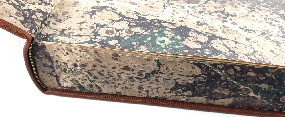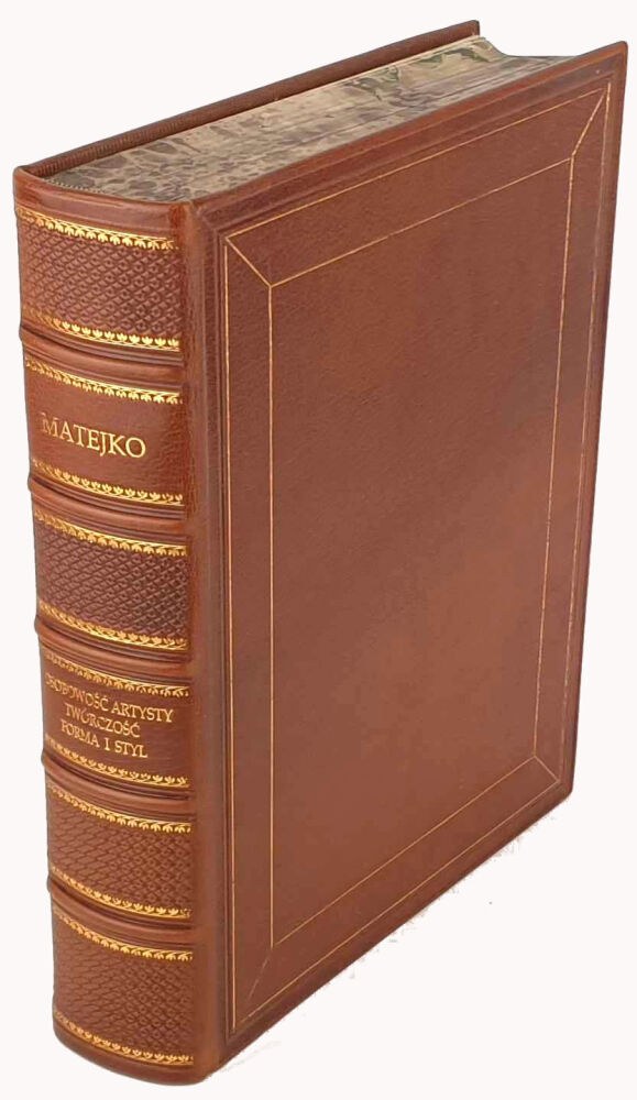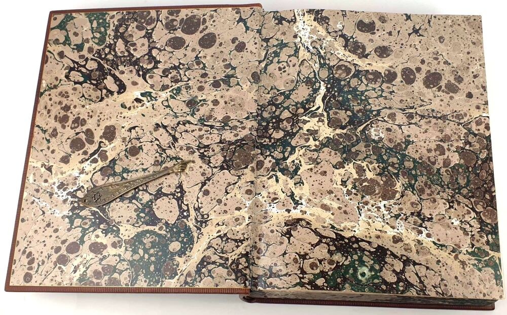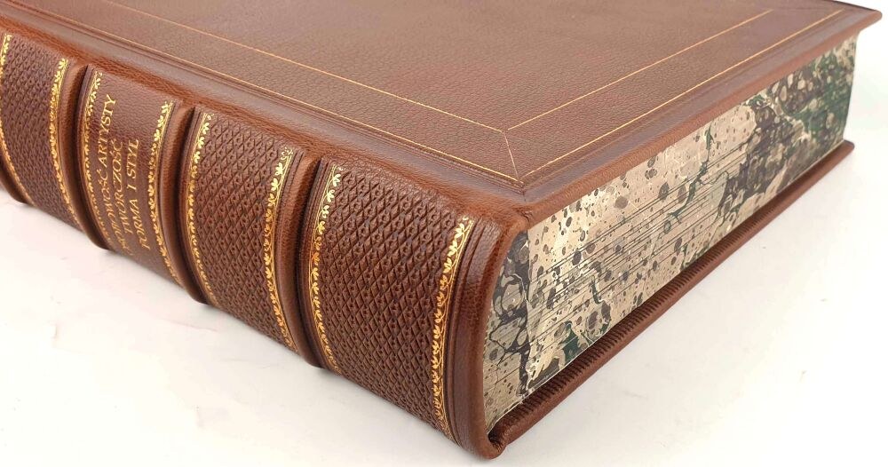 TWARDA OPRAWA PEŁNA SKÓRA WSPÓŁCZESNA. OKŁADKI OKOLONE TLOCZONĄ NA ŚLEPO I ZŁOTO RAMKĄ, GRZBIET Z WYPUKŁYMI ZWIĘZAMI, DEKORACYJNYMI, GŁĘBOKOTŁOCZONYMI ZDOBIENIAMI I ZŁOCENIAMI. RĘCZNIE BARWIONY W MASIE PAPIER MARMORYZOWANY NA WYKLEJKACH, WSZYSTKIE OBCIĘCIA KART BARWIONE TYM SAMYM WZOREM. WNĘTRZA OKŁADEK WYKOŃCZONE TŁOCZONĄ NA ŚLEPO LINIĄ.