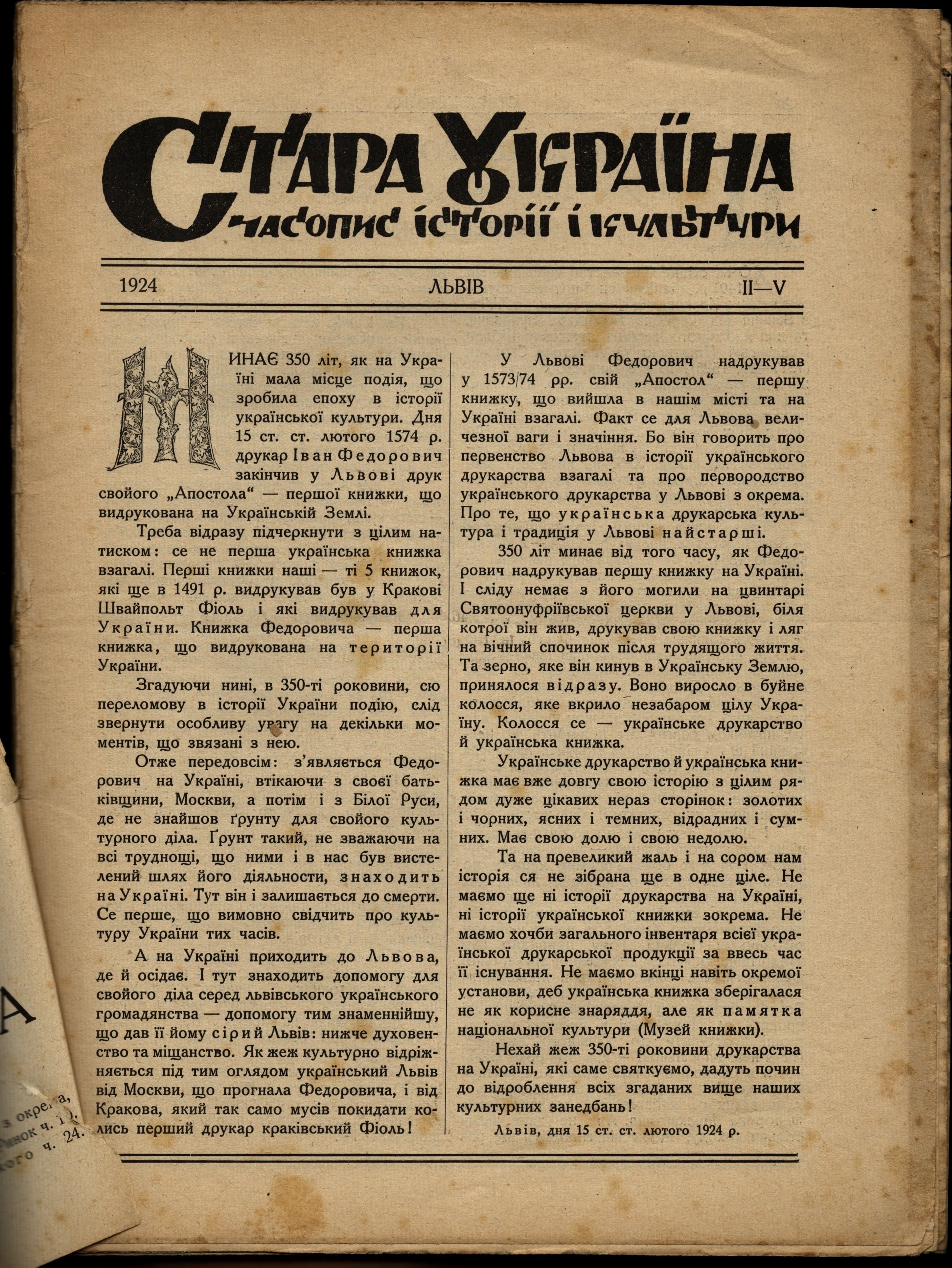 UKRAINIANA] Stara Ukraina. Czasopismo poświęcone historii i kulturze. Nr II-V. Rok 1924. Lwów. [W 350. Rocznicę Drukarstwa na Ukrainie]
