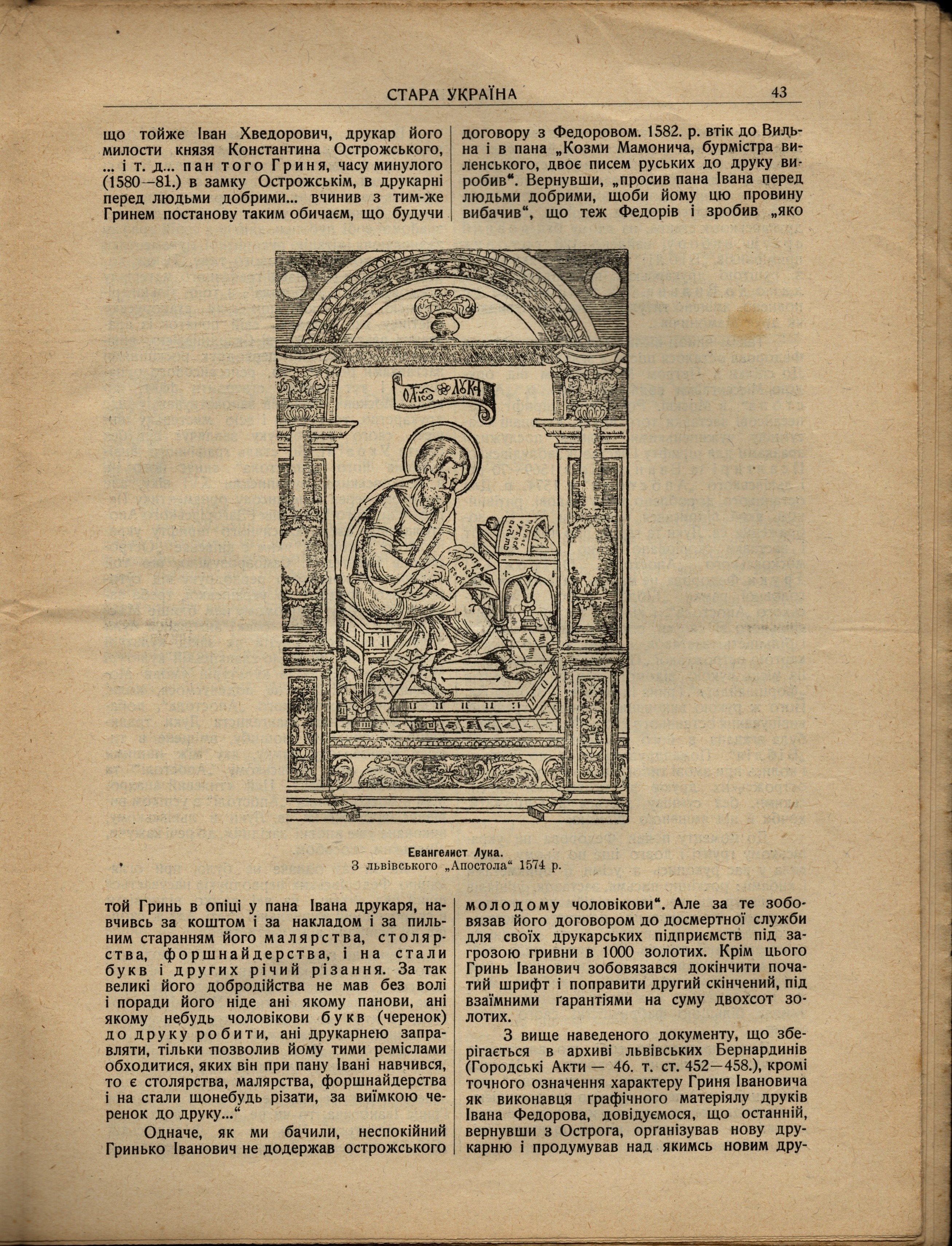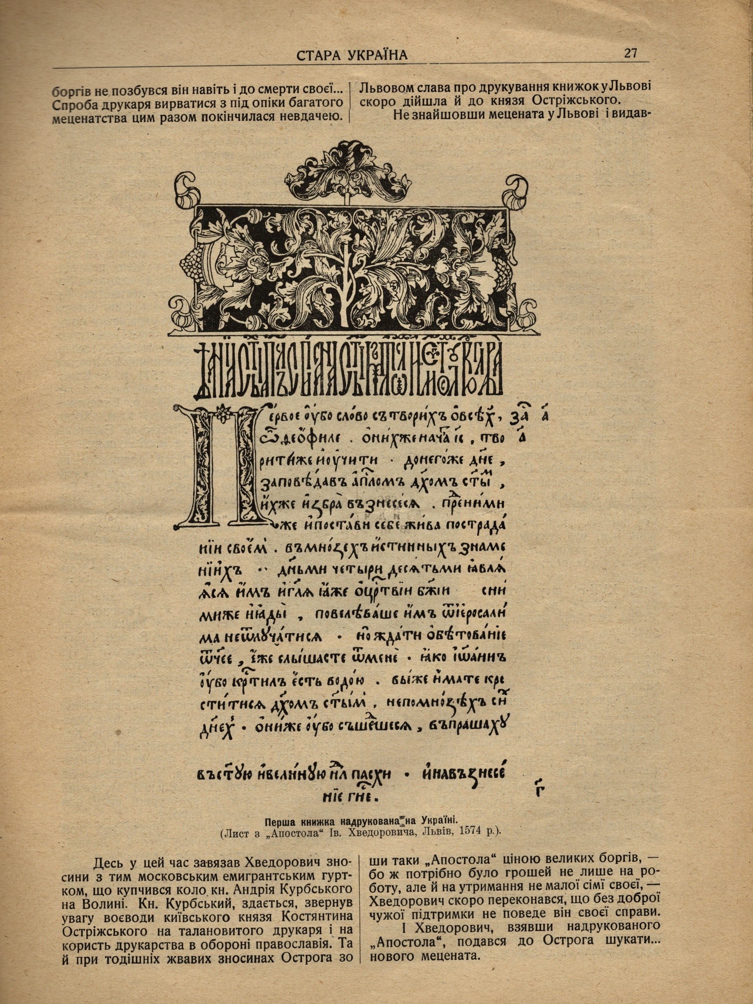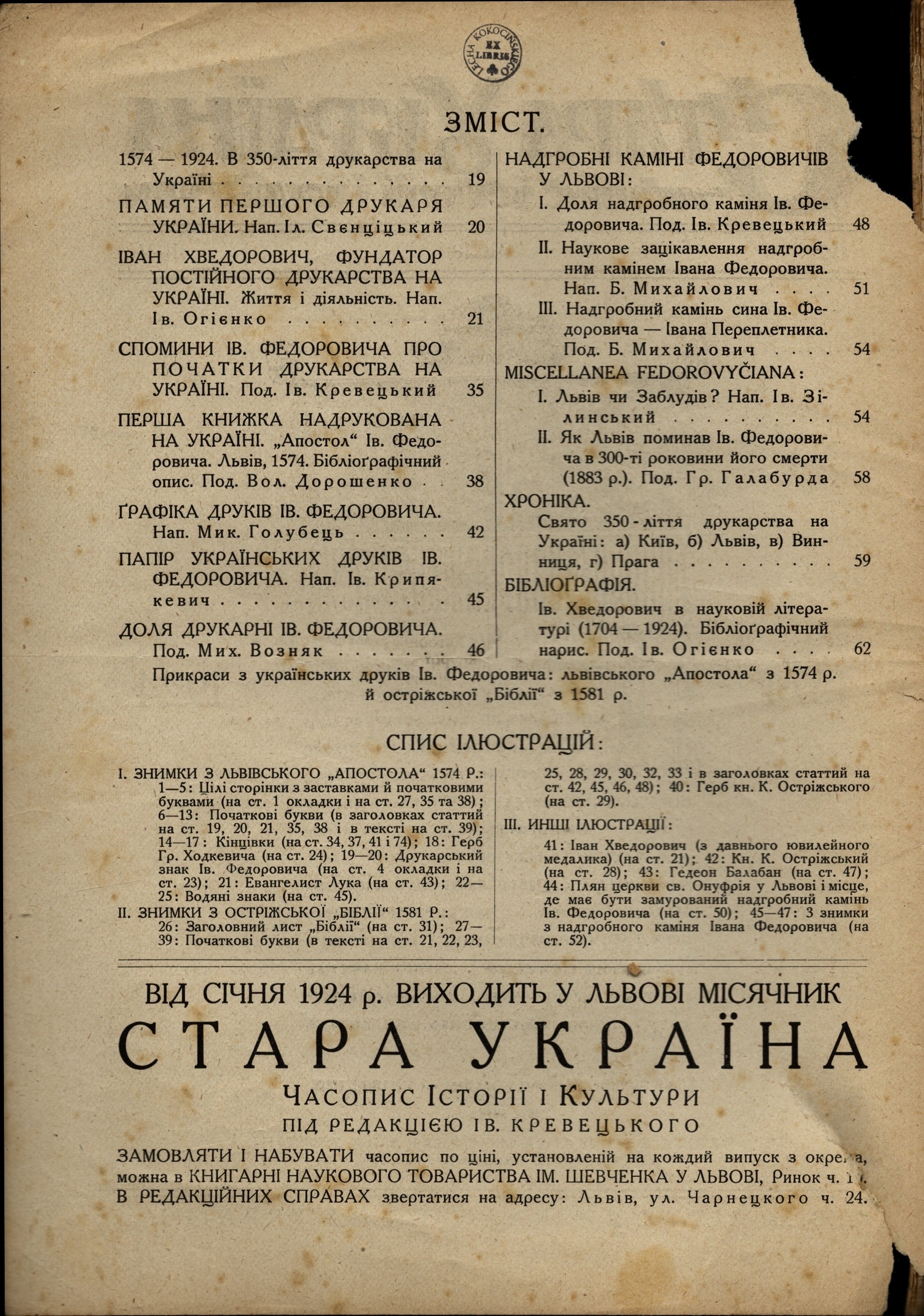 W treści: Iwan Chwedorowicz, twórca druku na Ukrainie. Życie i działalność; Wspomnienia Iw. Fedorowicza przed początkiem drukarstwa na Ukrainie; Pierwsza książka wydrukowana na Ukrainie "Apostoł" Lwów 1574; Obchody 350. rocznicy druku na Ukrainie.